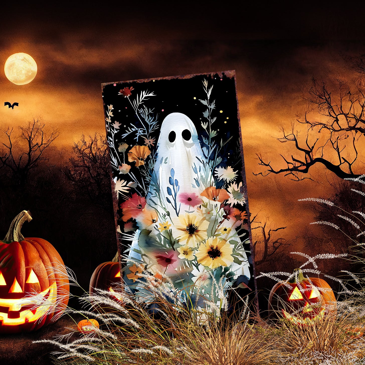10" Black Orange Blue And Yellow Solid Wood Wildflowers Halloween Ghost Garden Stake