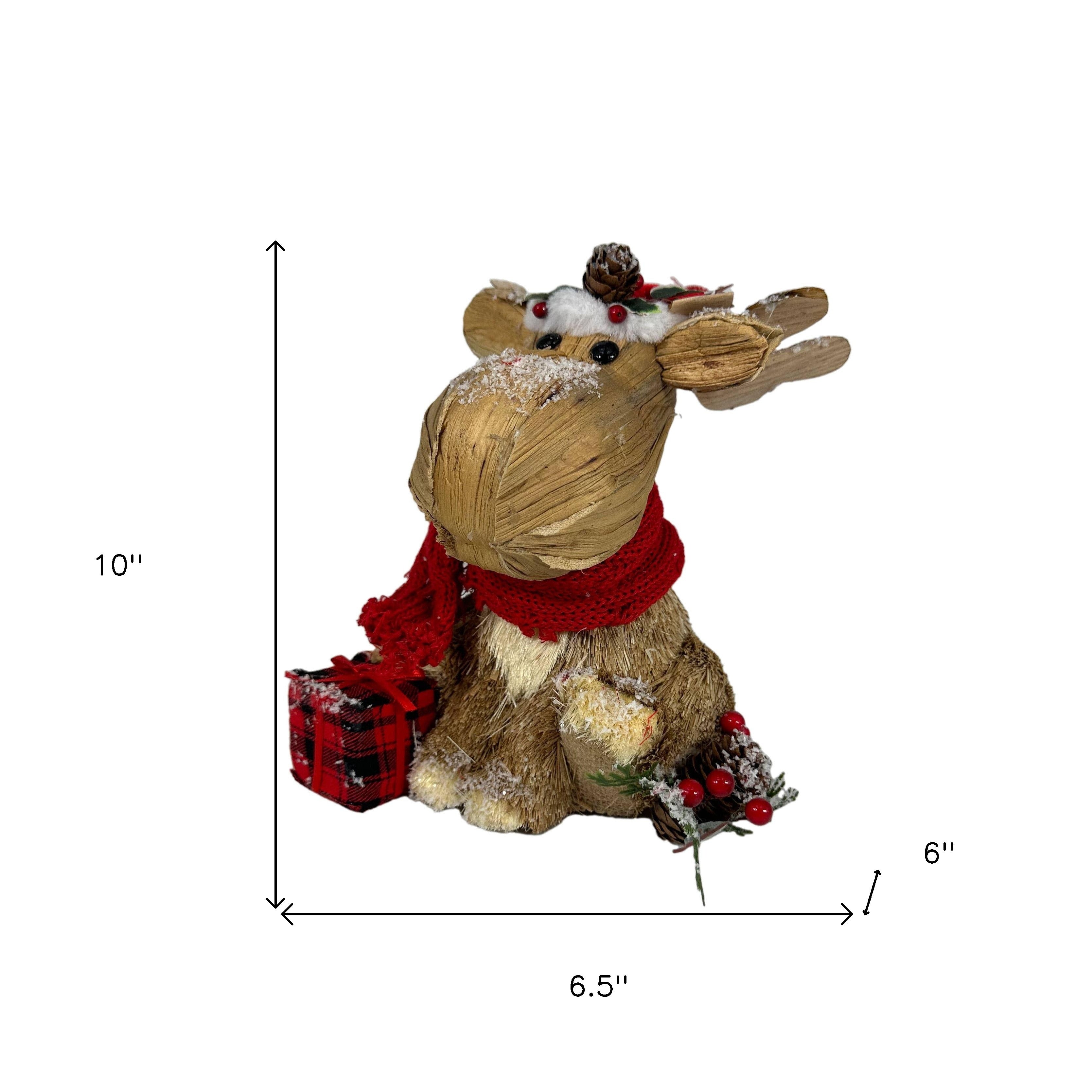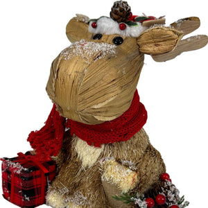 10" Brown Red And Green Straw Reindeer Christmas Reindeer Figurine