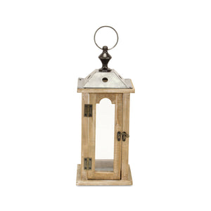 16" Natural And Gray Geometric Metal And Solid Wood Tabletop Lantern Candle Holder