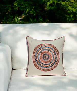 18" X 18" Beige and Blue Abstract Indoor Outdoor Throw Pillow