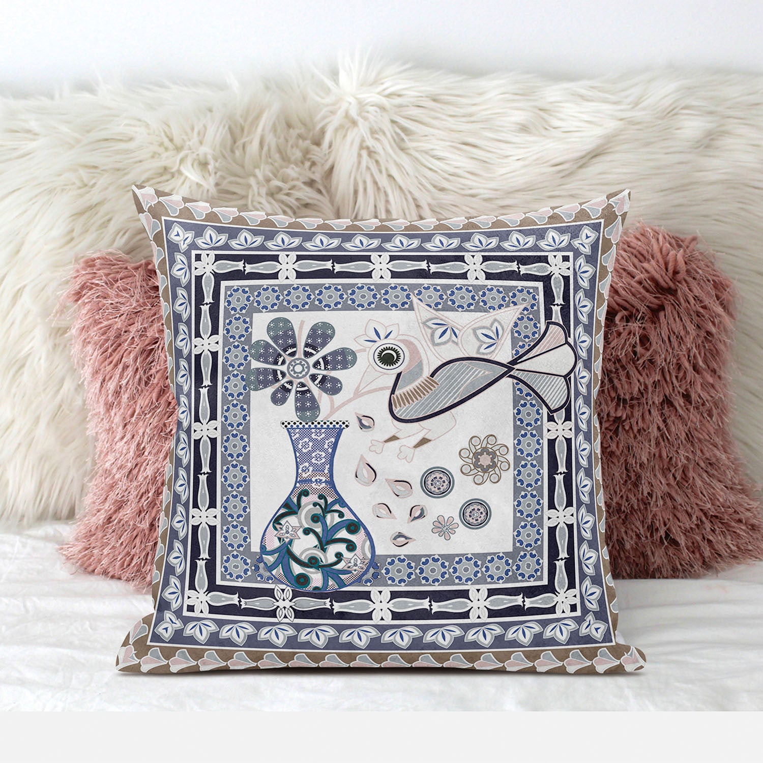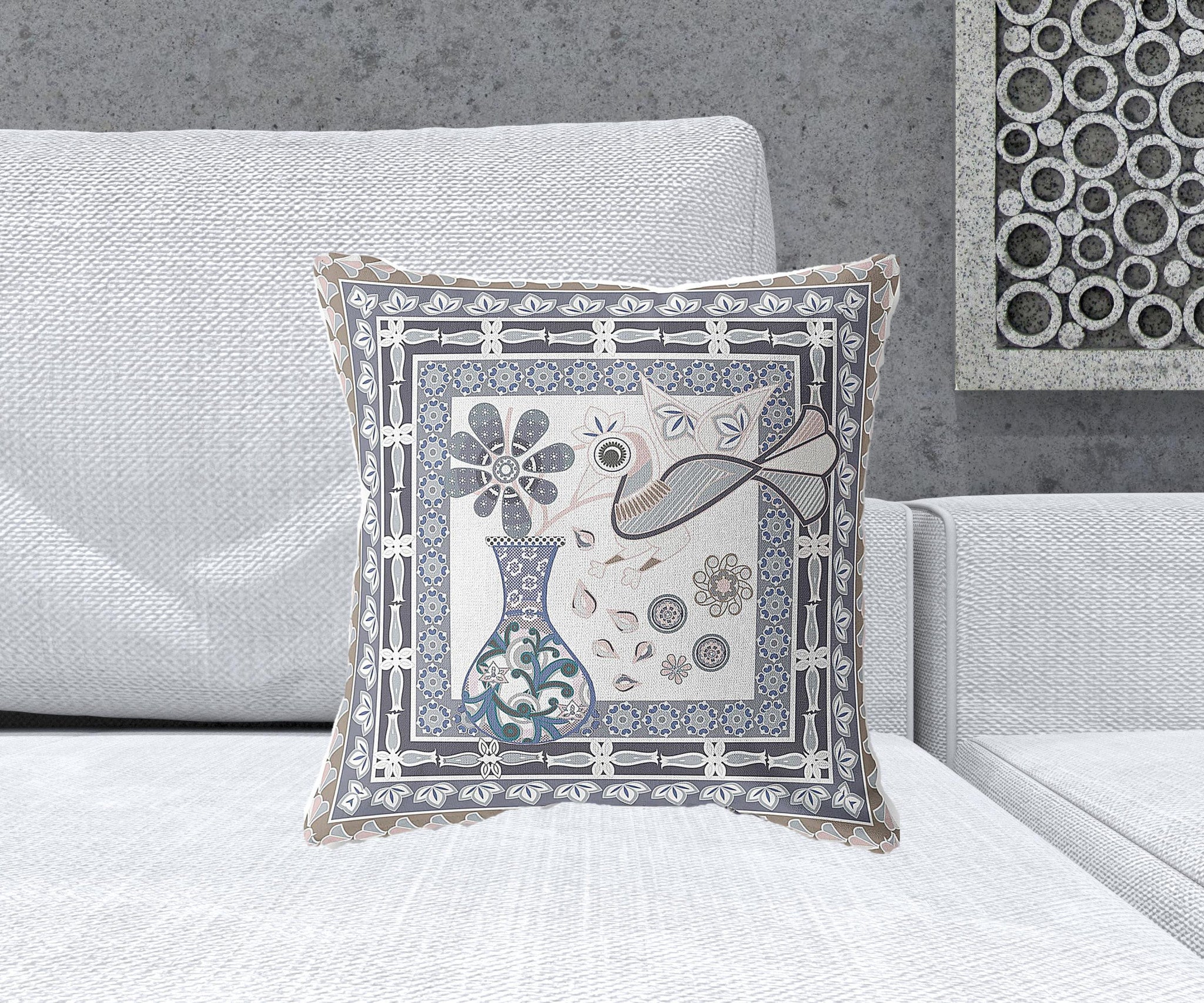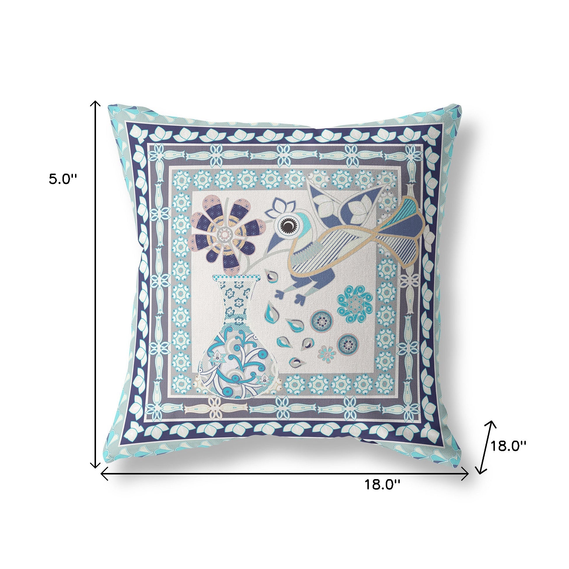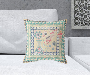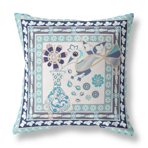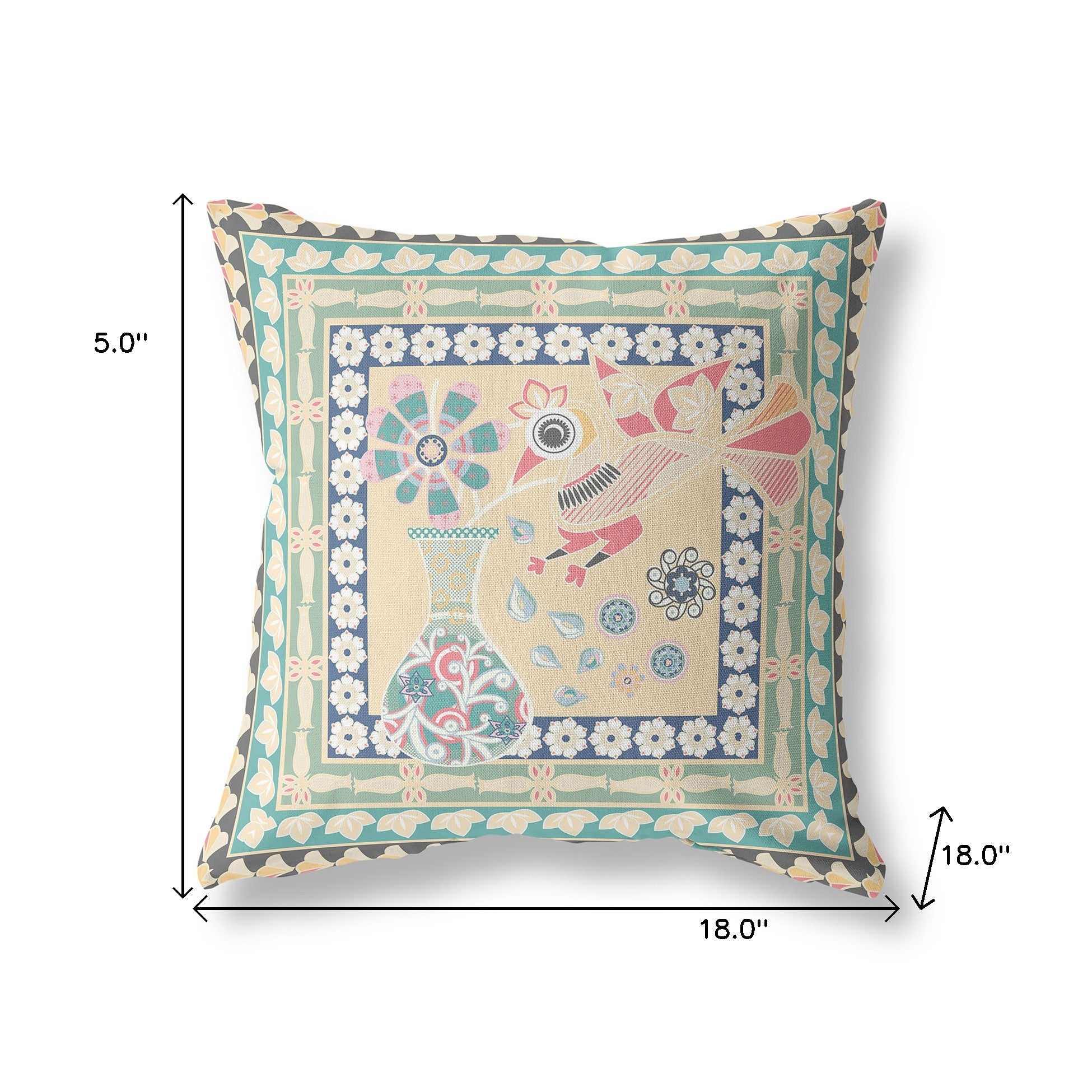 18" x 18" Beige Peacock Blown Seam Floral Indoor Outdoor Throw Pillow