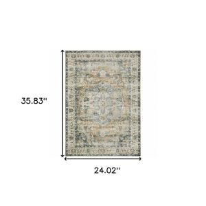 2' X 3' Blue And Gold Oriental Printed Non Skid Area Rug