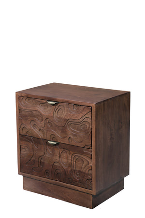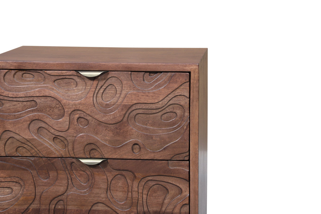 26" Brown Solid Wood Carved Abstract Two Drawer Nightstand