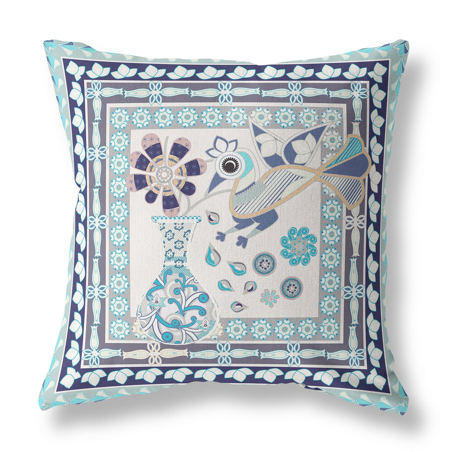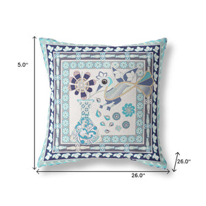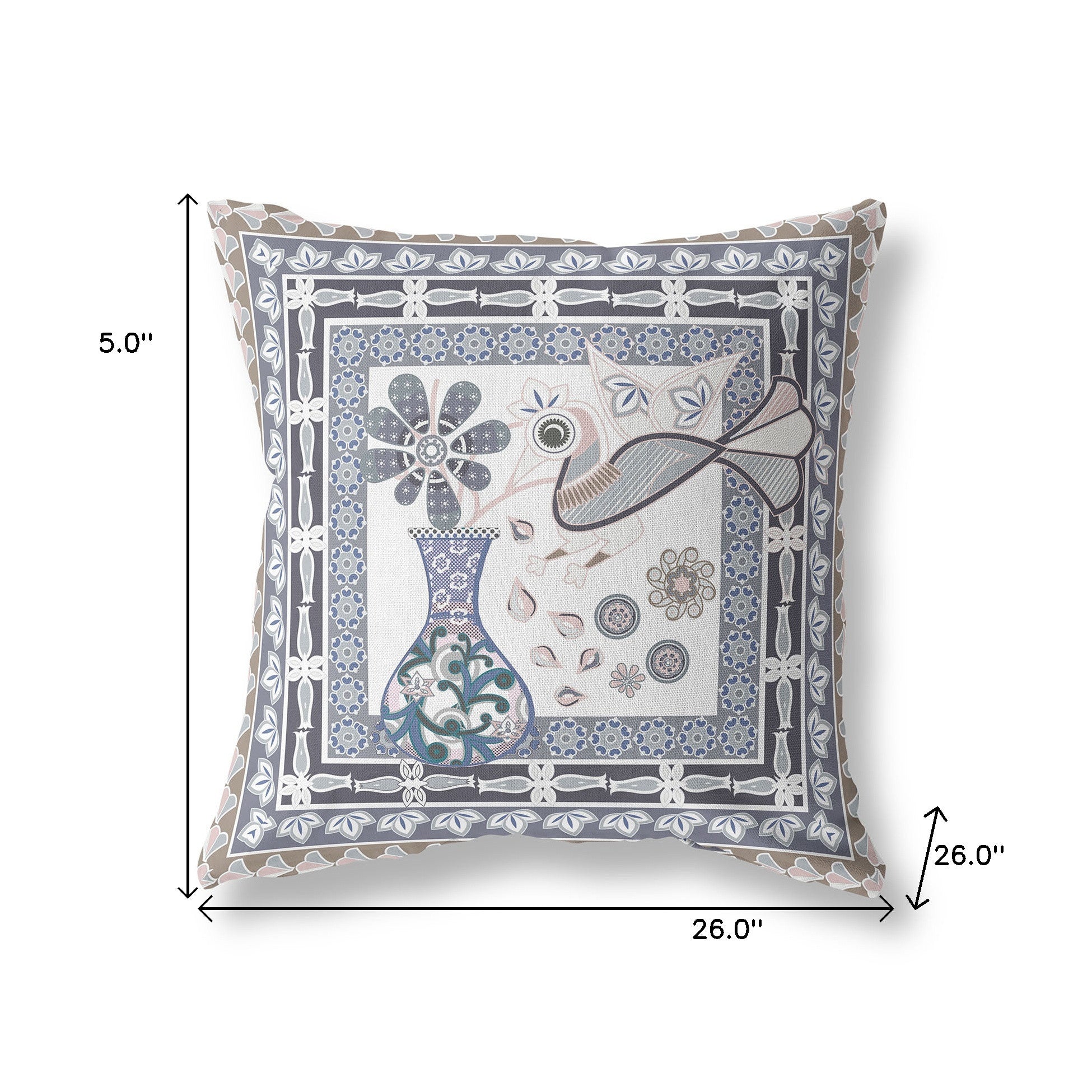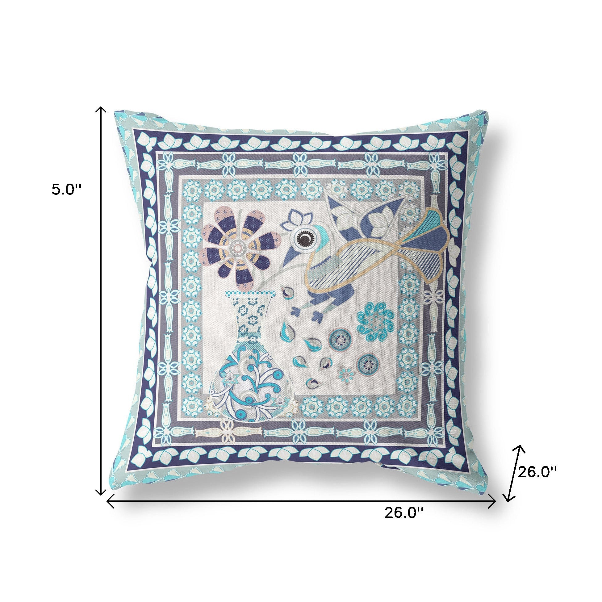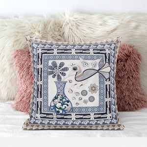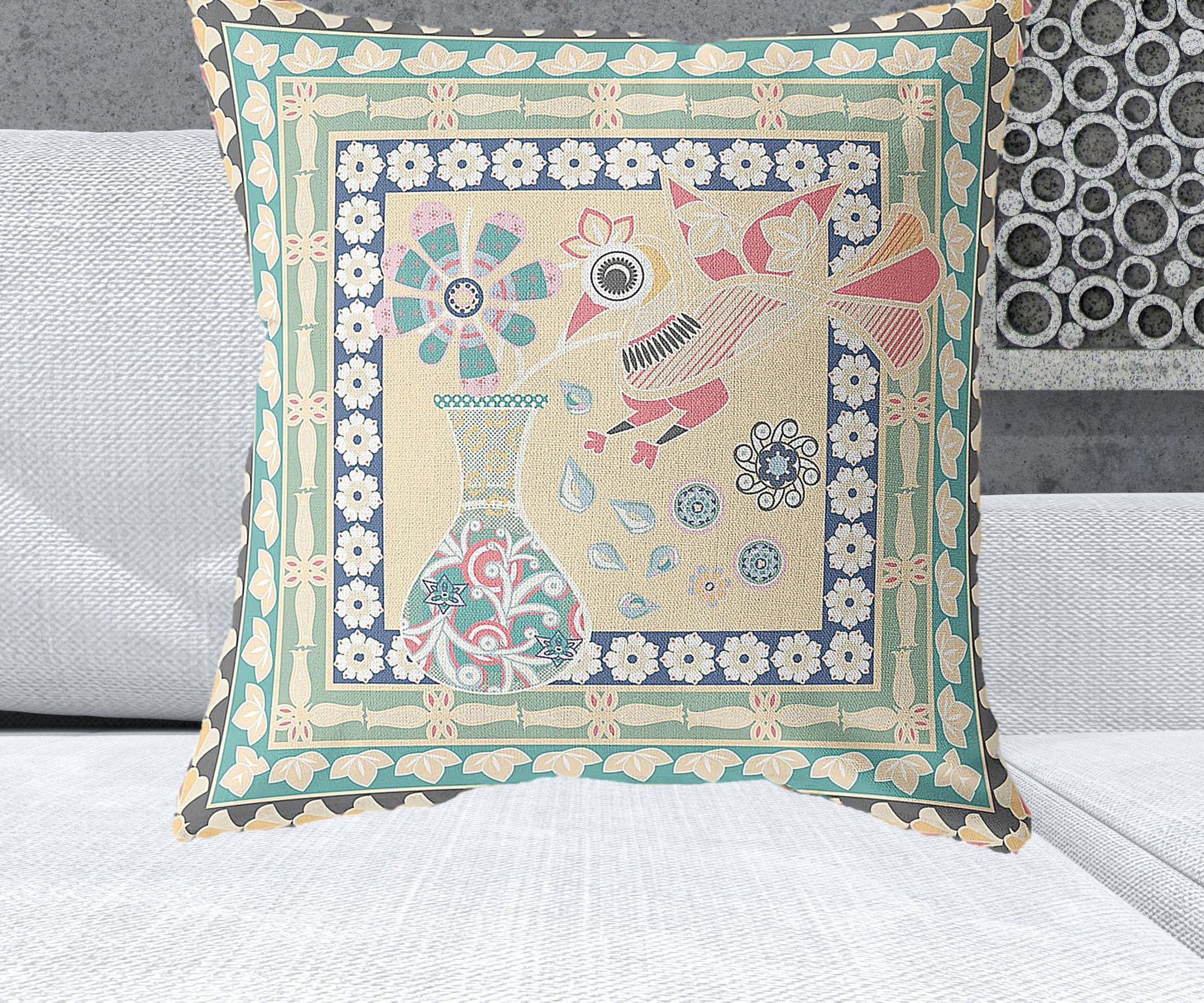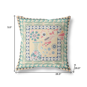 26" x 26" Beige Peacock Blown Seam Floral Indoor Outdoor Throw Pillow