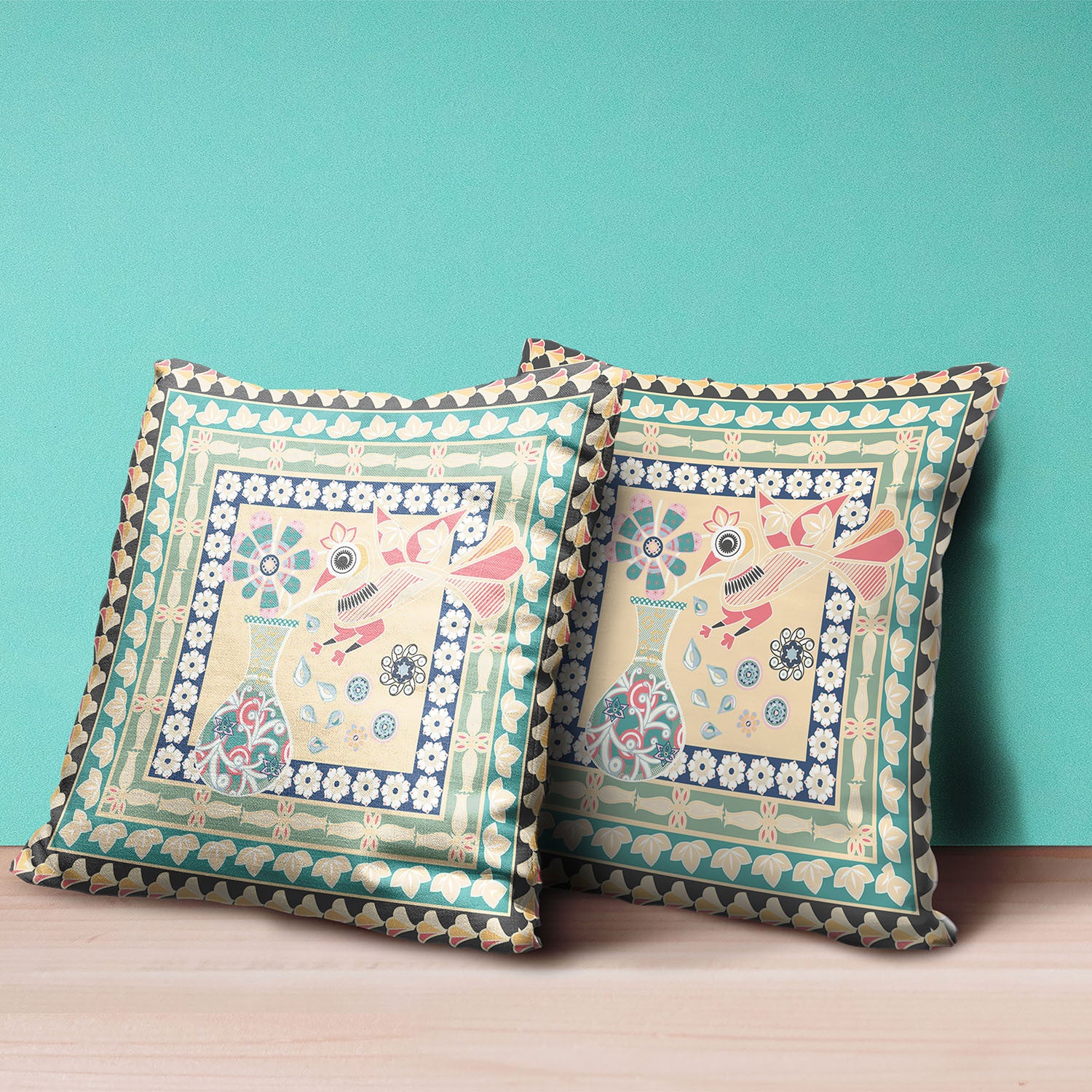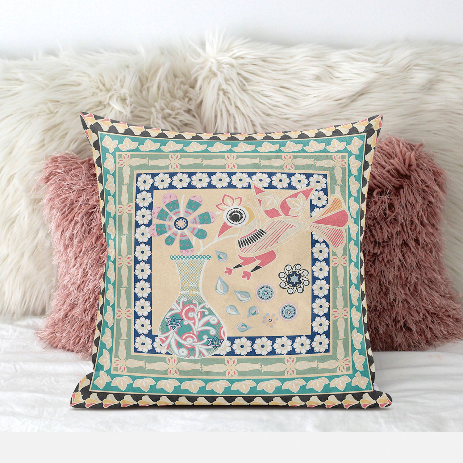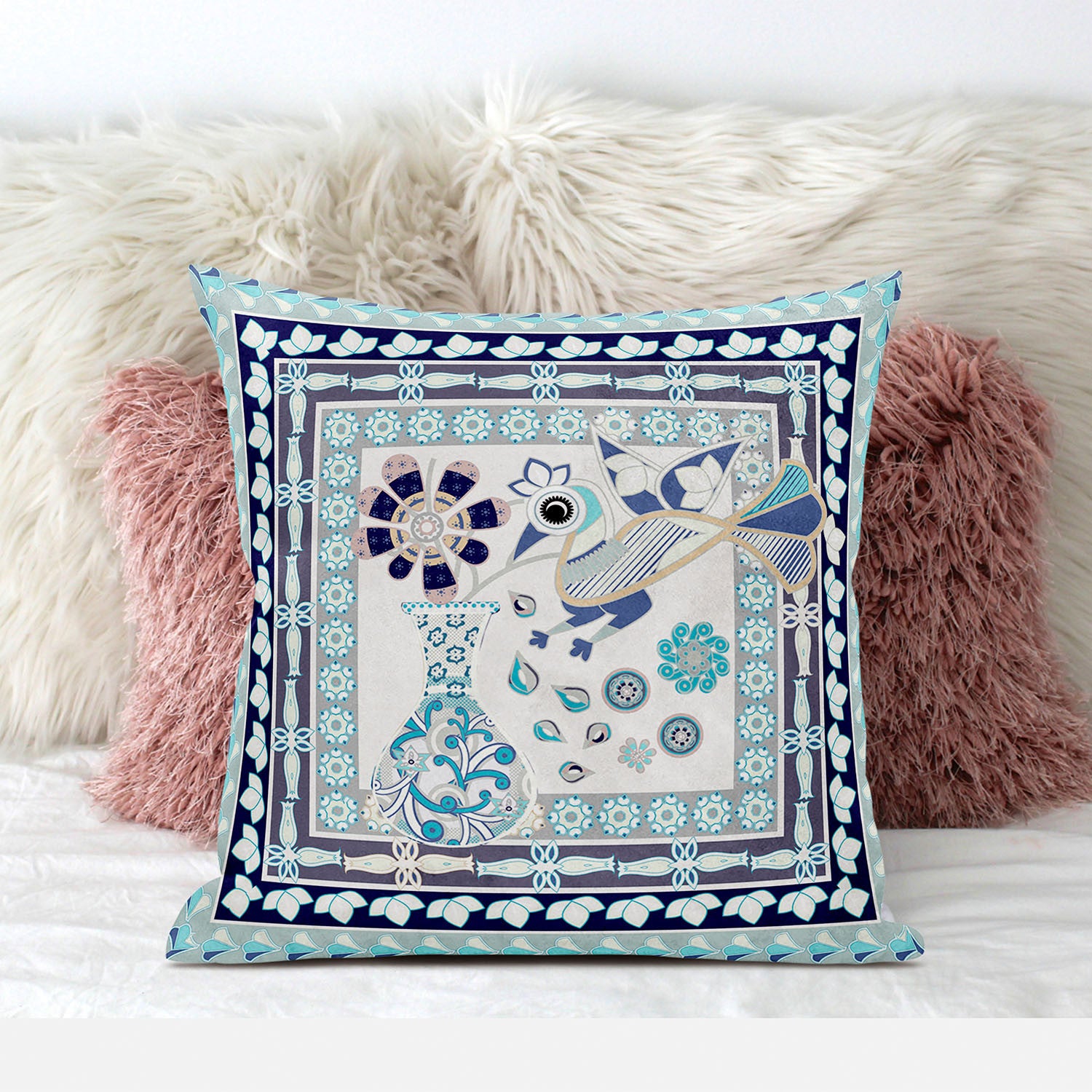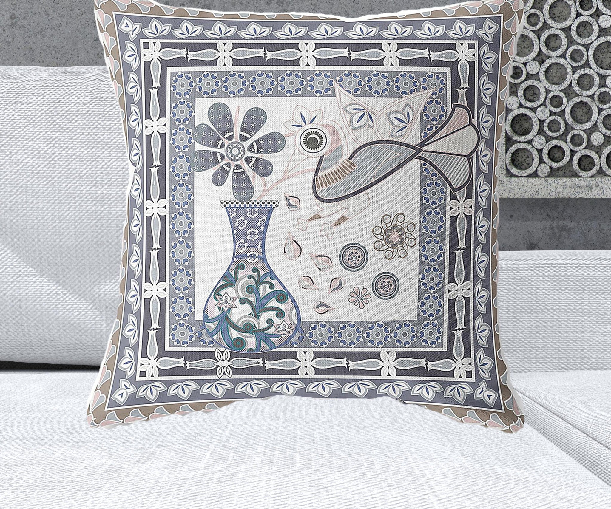 26" x 26" Beige Peacock Blown Seam Floral Indoor Outdoor Throw Pillow