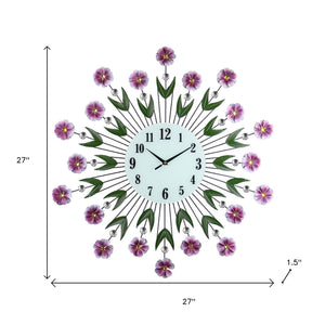 27" Purple Green And White Metal and Glass Silent Analog Floral Round Wall Clock