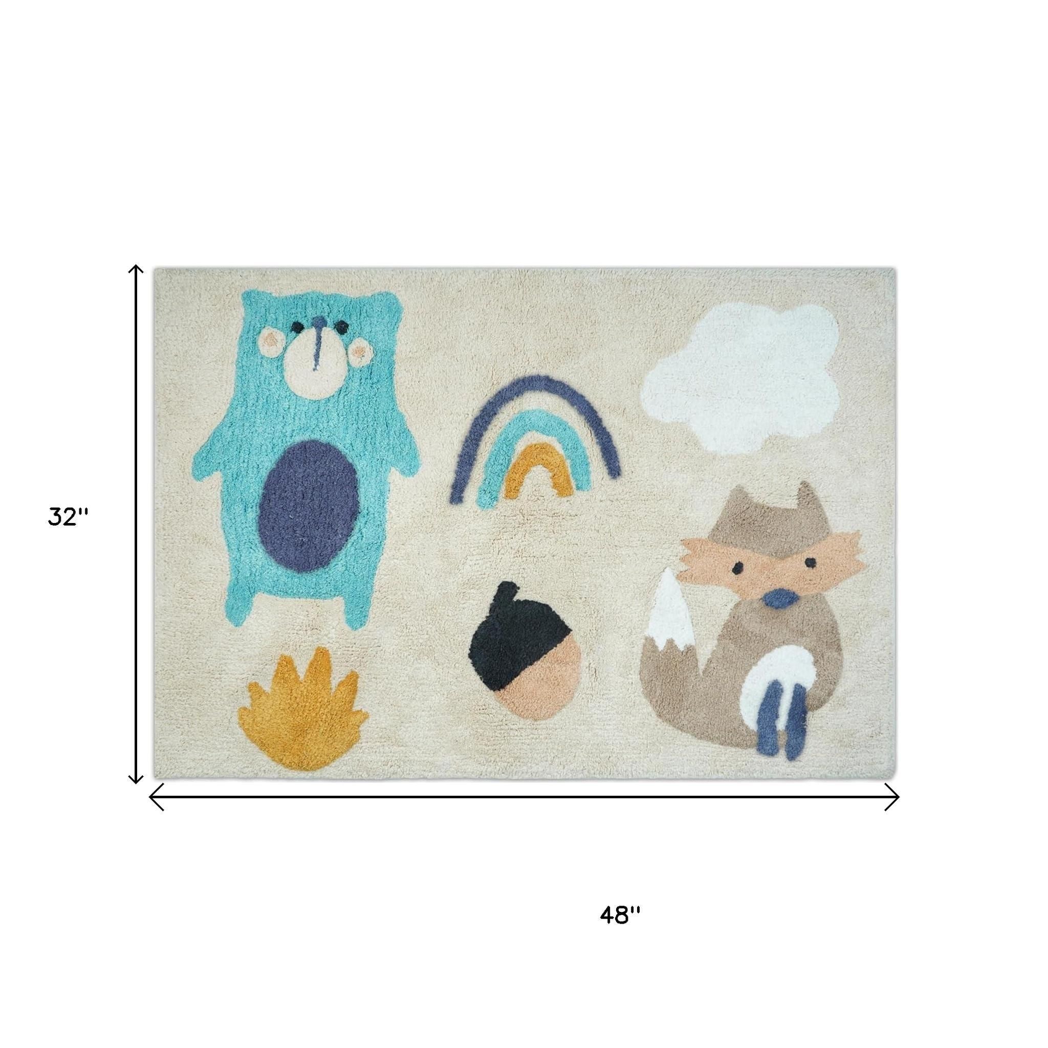 3' X 4' Beige And Blue Woodland Animals Youthful Washable Area Rug