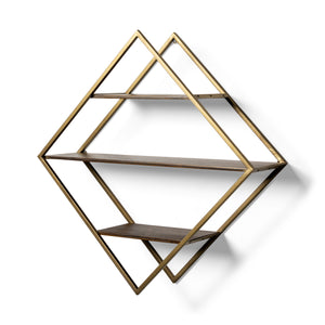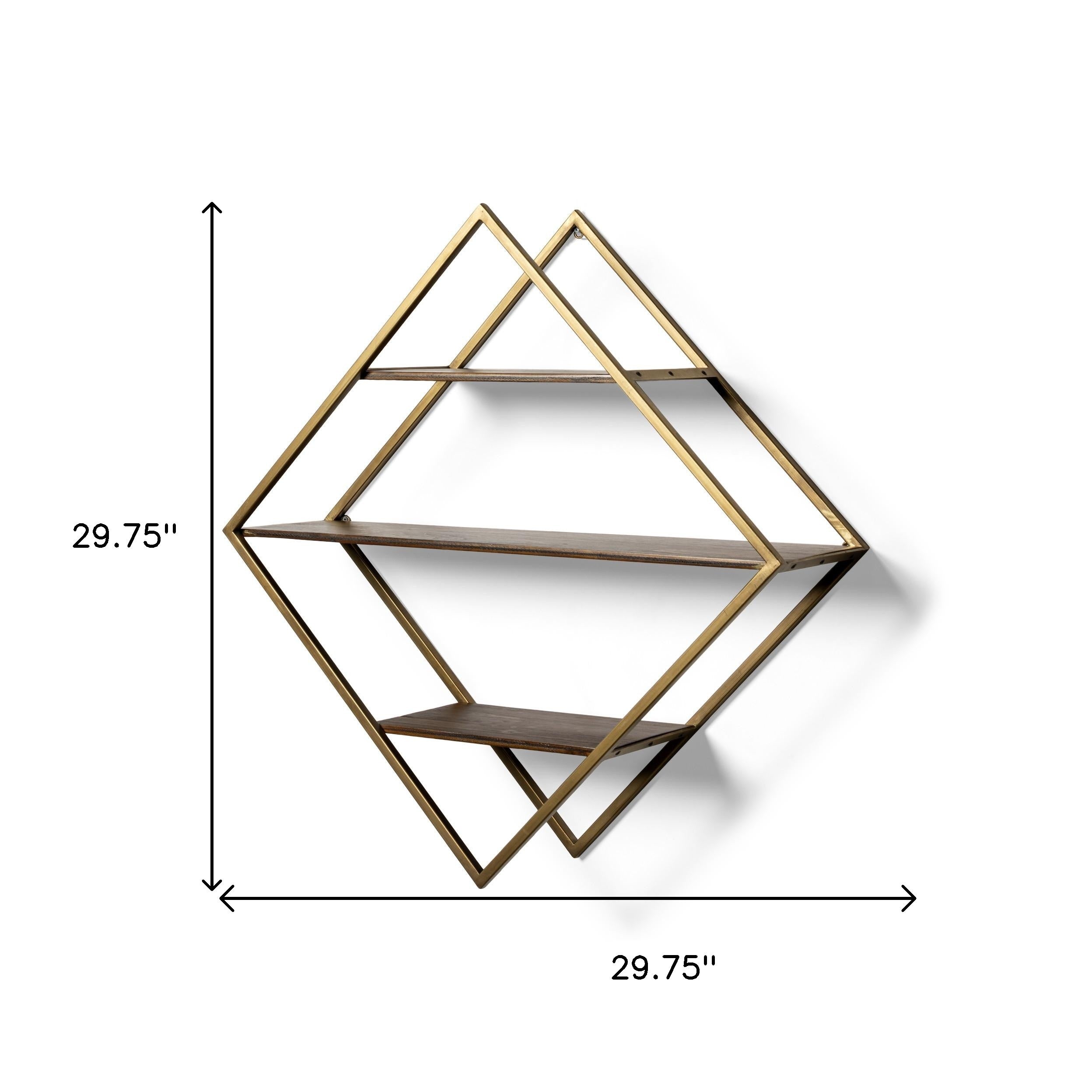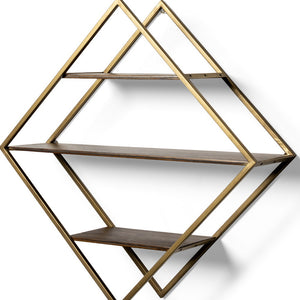30" Antiqued Brass And Brown Metal And Solid Wood Diamond Shaped Accent Shelf