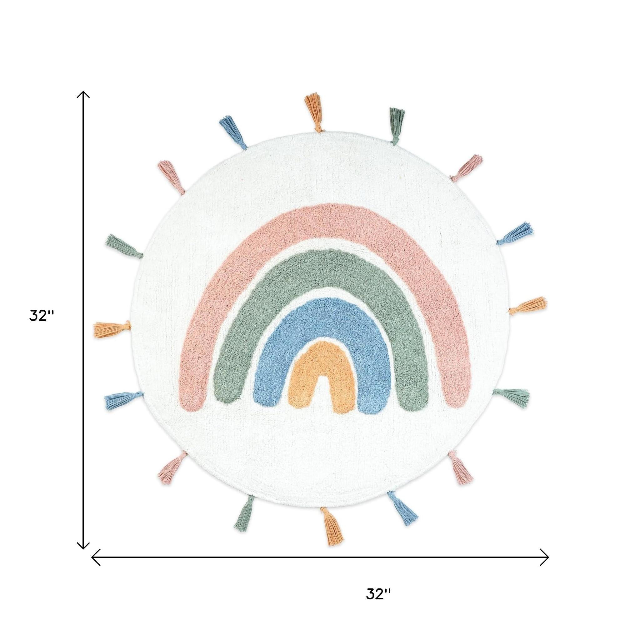 32" White Blue And Pink Cotton Rainbows Round Youthful Bath Rug