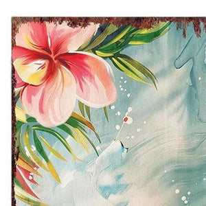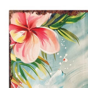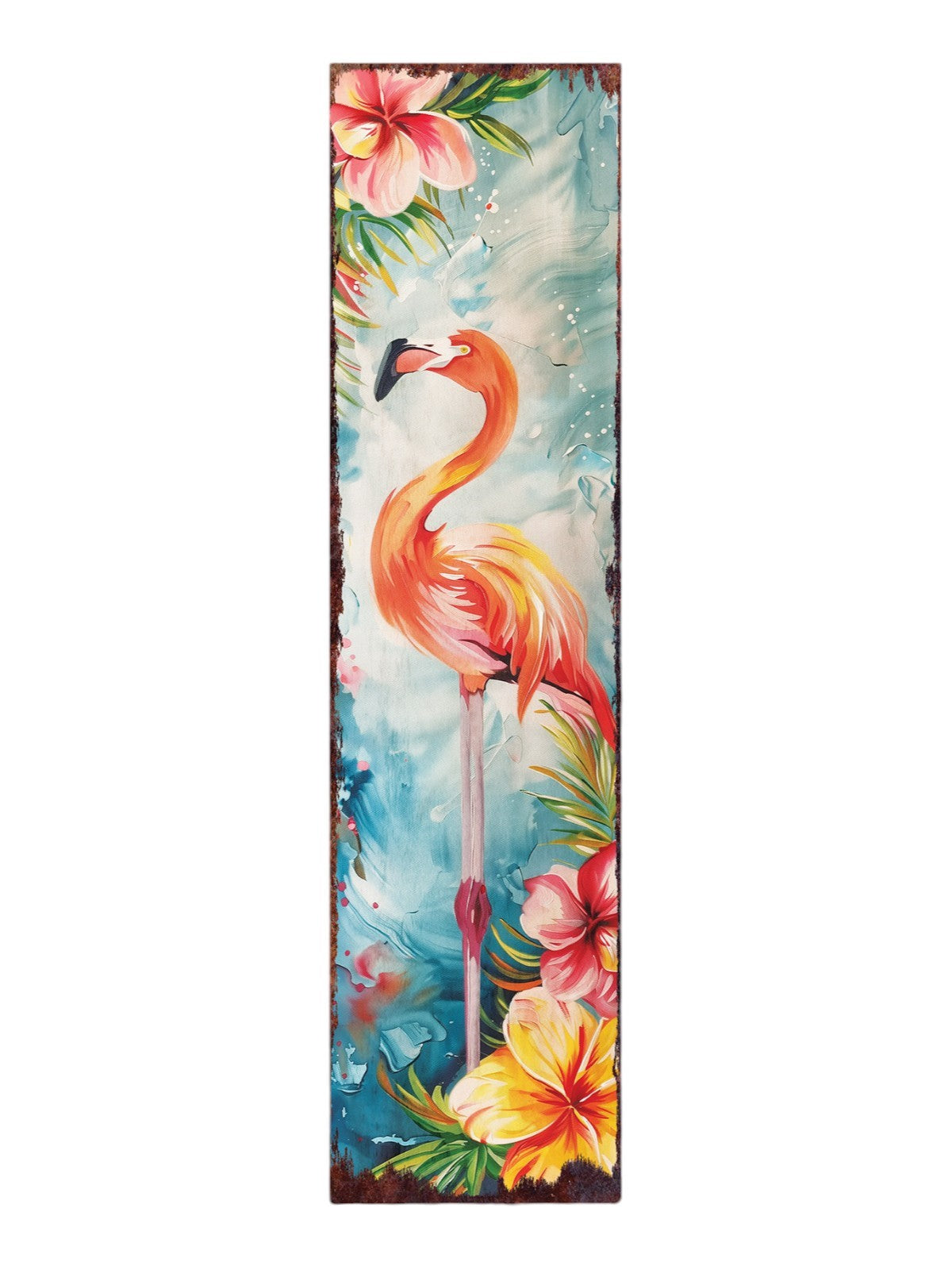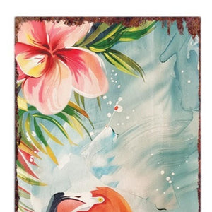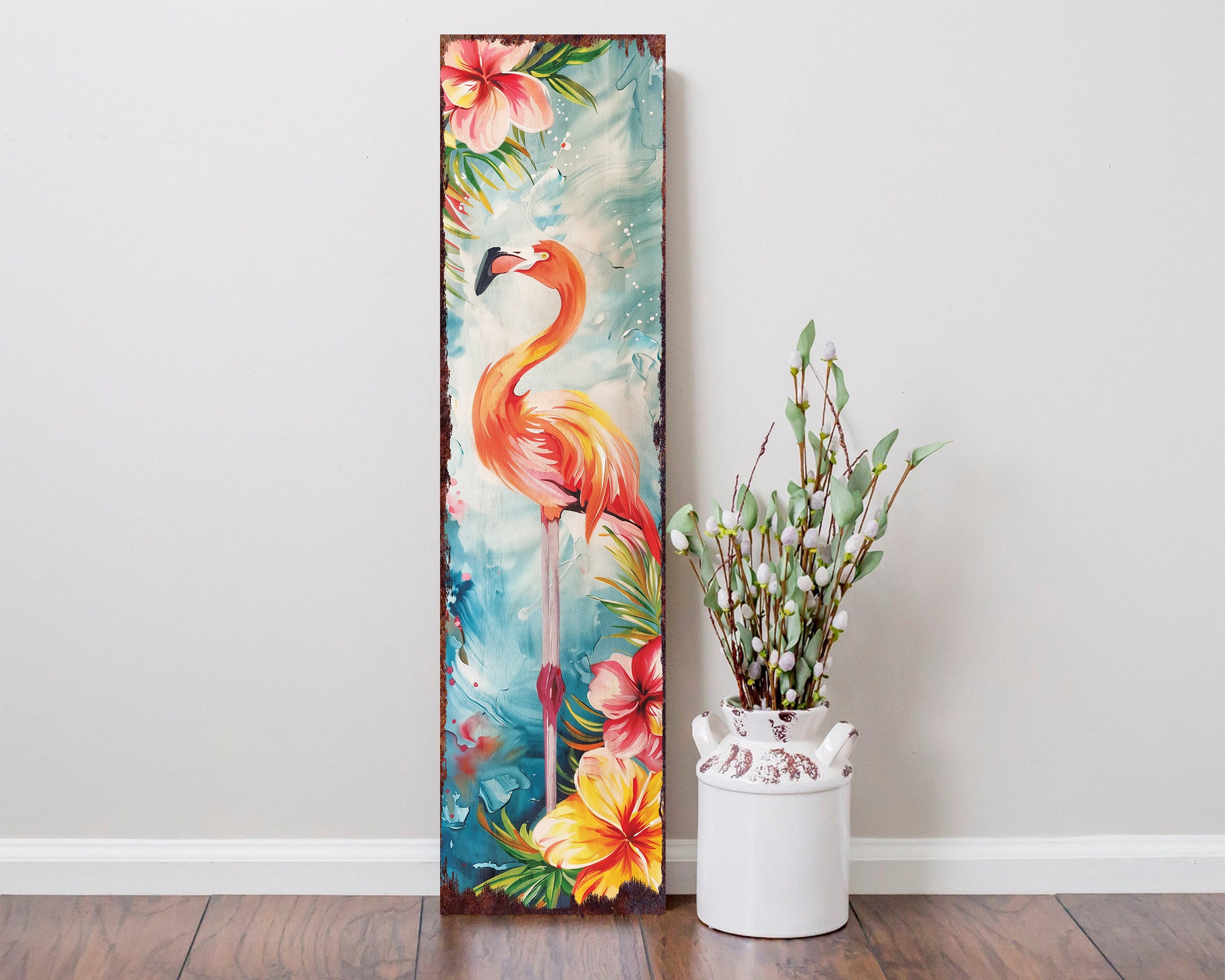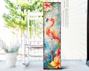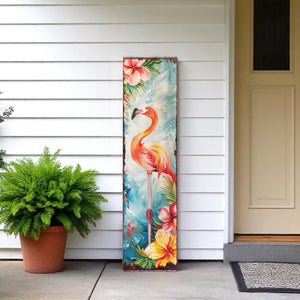 36" Blue Coral And Pink Solid Wood Tropical Floral Flamingo Porch Sign