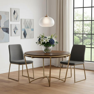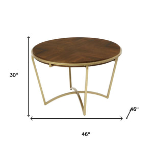 46" Brown And Gold Solid Wood And Metal Trestle Base Round Top Dining Table