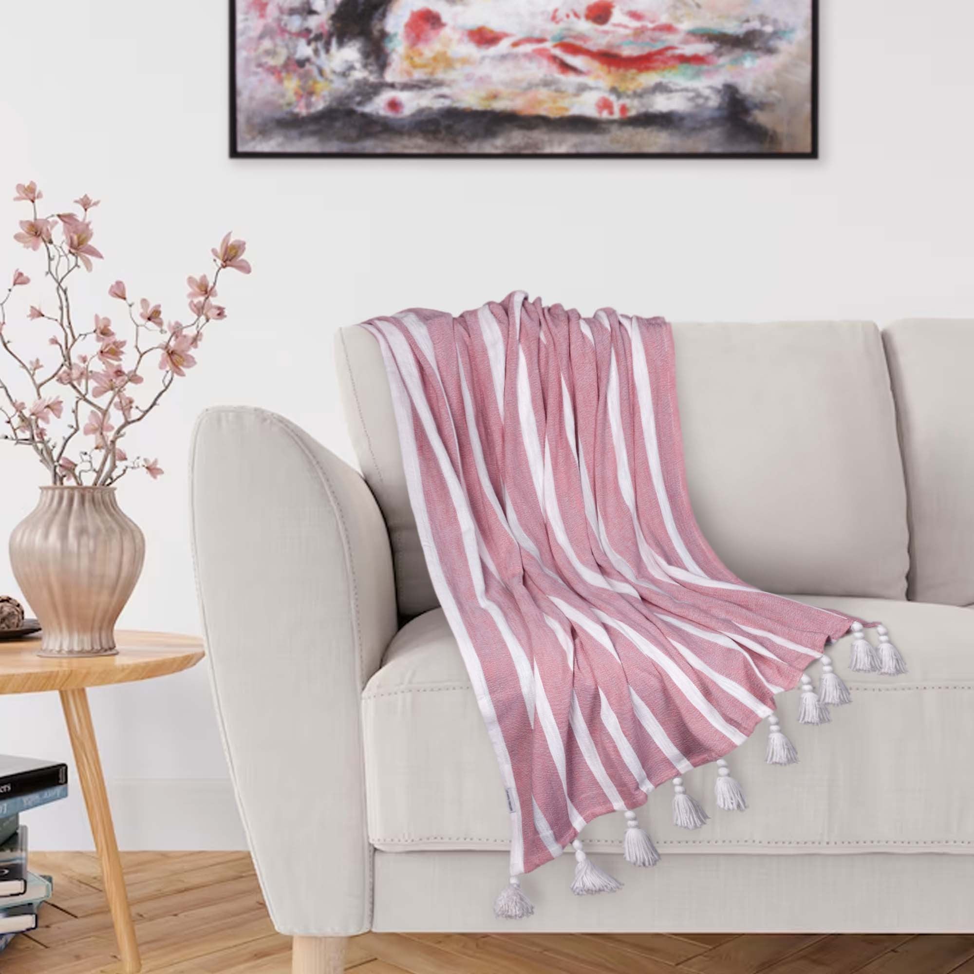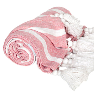 50" X 60" Pink and White Woven Cotton Striped Throw Blanket with Tassels