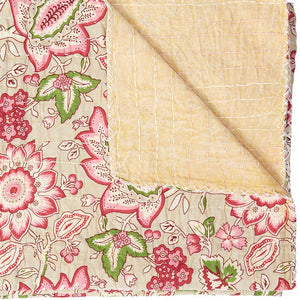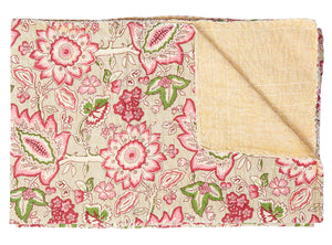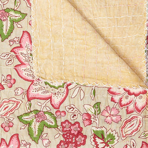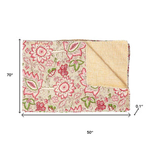 50" X 70" Beige And Pink Floral Cotton Quilted Kantha Throw Blanket with Embroidery