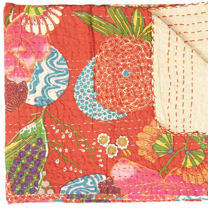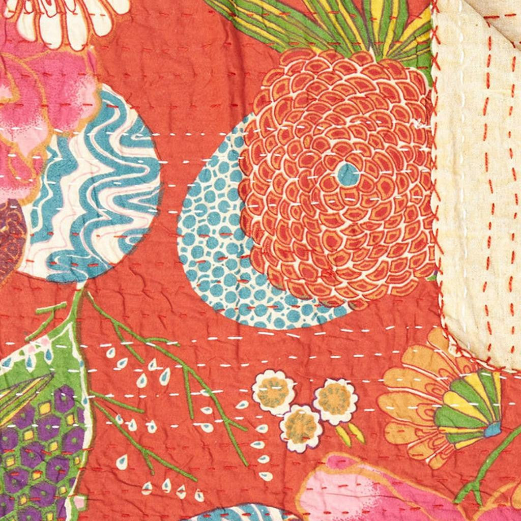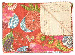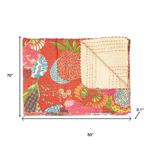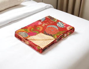 50" X 70" Blue Green And Red Floral Cotton Quilted Kantha Throw Blanket with Embroidery