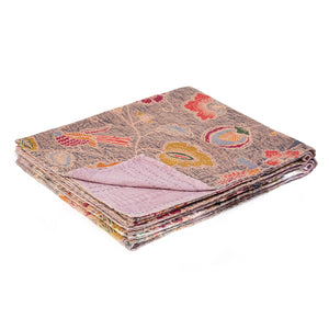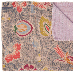 50" X 70" Gray and Pink Kantha Cotton Floral Throw Blanket with Embroidery