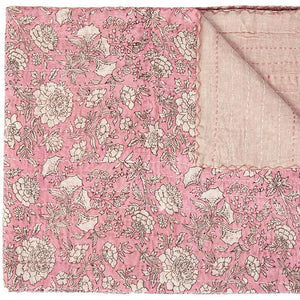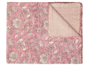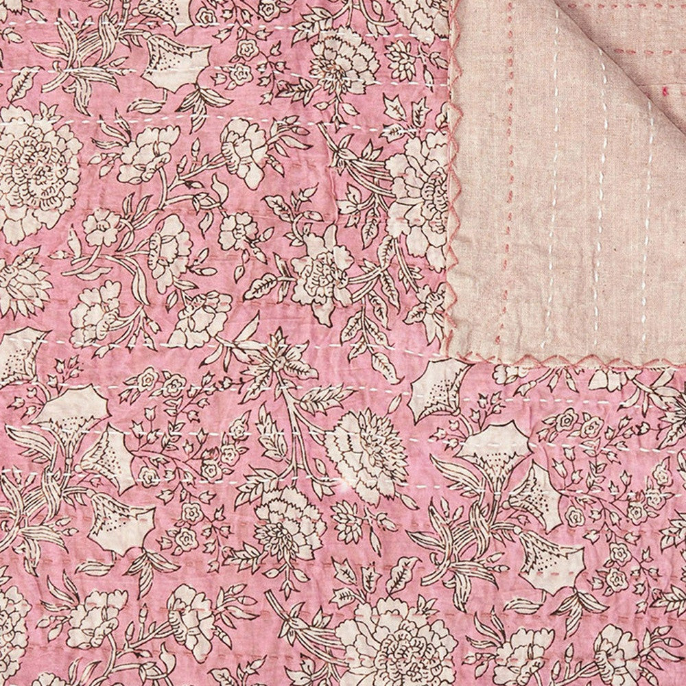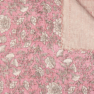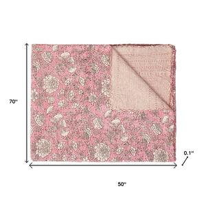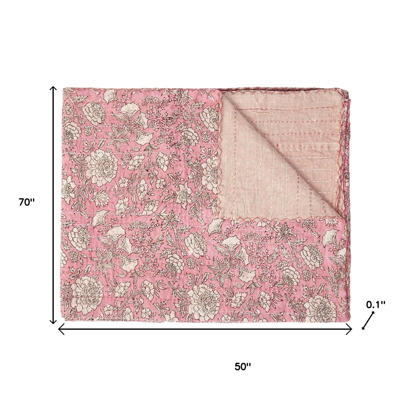 50" X 70" Pink And Blush Floral Cotton Quilted Kantha Throw Blanket with Embroidery