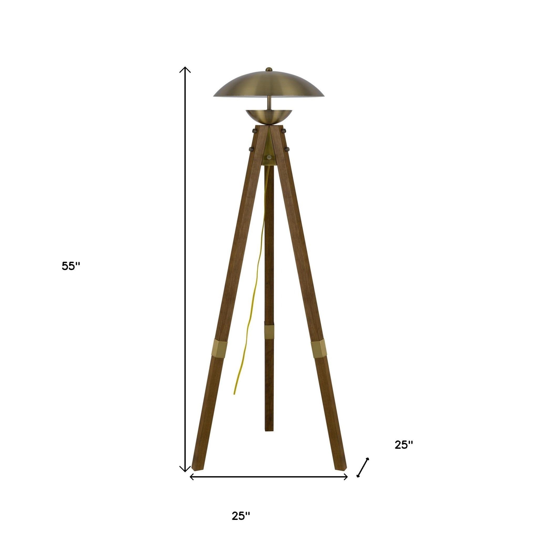 55" Brass Tripod Floor Lamp With Antiqued Brass Dome Shade