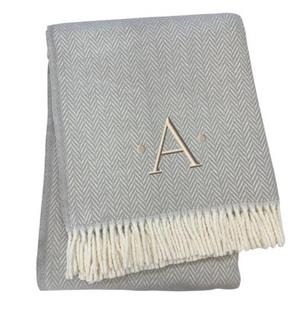55" X 70" Gray And White Herringbone Cotton Blend A Initial Throw Blanket with Tassels And Embroidery