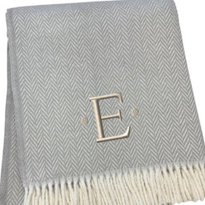 55" X 70" Gray And White Herringbone Cotton Blend E Initial Throw Blanket with Tassels And Embroidery