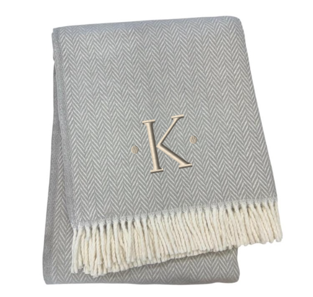 55" X 70" Gray And White Herringbone Cotton Blend K Initial Throw Blanket with Tassels And Embroidery