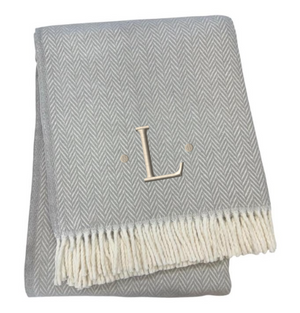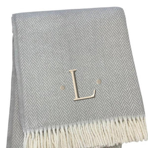 55" X 70" Gray And White Herringbone Cotton Blend L Initial Throw Blanket with Tassels And Embroidery