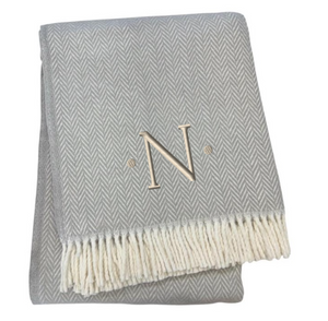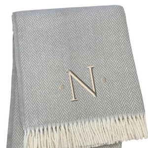 55" X 70" Gray And White Herringbone Cotton Blend N Initial Throw Blanket with Tassels And Embroidery