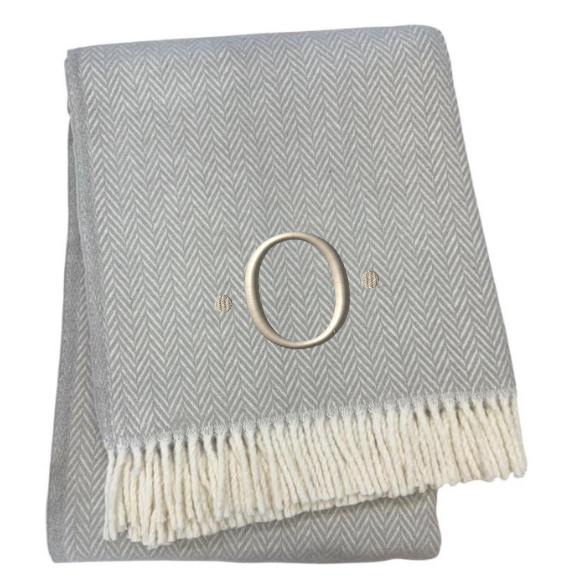 55" X 70" Gray And White Herringbone Cotton Blend O Initial Throw Blanket with Tassels And Embroidery