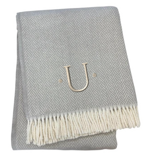 55" X 70" Gray And White Herringbone Cotton Blend U Initial Throw Blanket with Tassels And Embroidery
