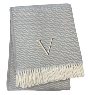 55" X 70" Gray And White Herringbone Cotton Blend V Initial Throw Blanket with Tassels And Embroidery