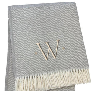 55" X 70" Gray And White Herringbone Cotton Blend W Initial Throw Blanket with Tassels And Embroidery