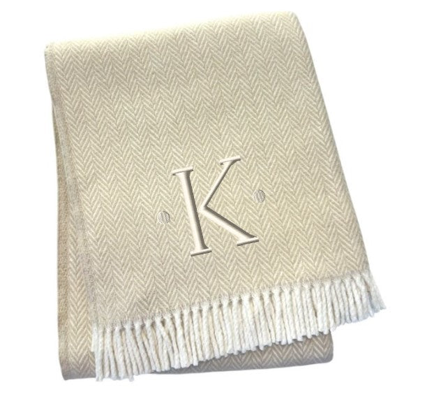 55" X 70" Linen And White Herringbone Cotton Blend K Initial Throw Blanket with Tassels And Embroidery