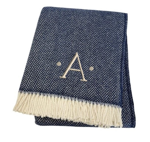 55" X 70" Navy Blue And White Herringbone Cotton Blend A Initial Throw Blanket with Tassels And Embroidery