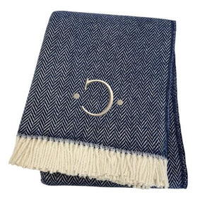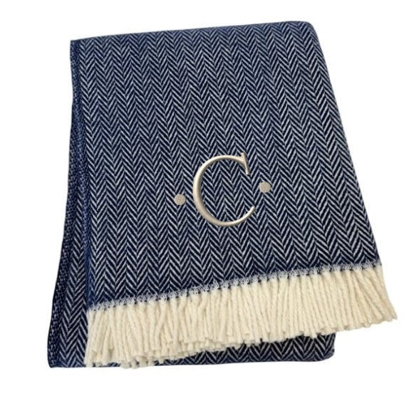 55" X 70" Navy Blue And White Herringbone Cotton Blend C Initial Throw Blanket with Tassels And Embroidery