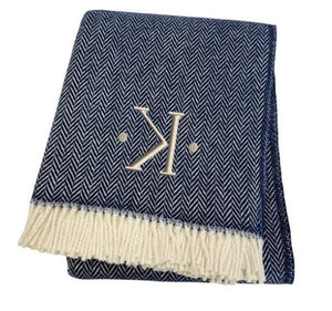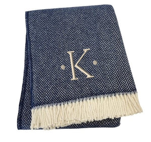 55" X 70" Navy Blue And White Herringbone Cotton Blend K Initial Throw Blanket with Tassels And Embroidery