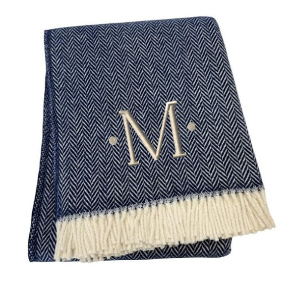 55" X 70" Navy Blue And White Herringbone Cotton Blend M Initial Throw Blanket with Tassels And Embroidery