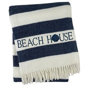 55" X 70" Navy Blue And White Stripe Cotton Beach House Embroidered Throw Blanket with Fringe