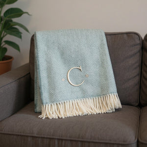 55" X 70" Sky Blue And White Herringbone Cotton Blend C Initial Throw Blanket with Tassels And Embroidery
