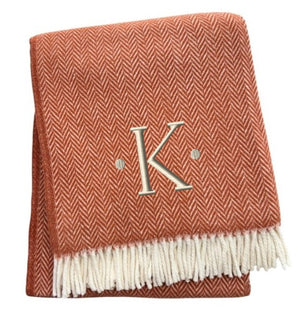 55" X 70" Terra Cotta And White Herringbone Cotton Blend K Initial Throw Blanket with Tassels And Embroidery