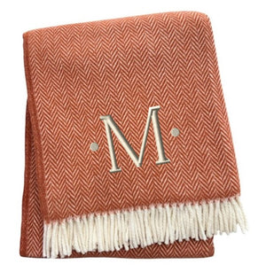55" X 70" Terra Cotta And White Herringbone Cotton Blend M Initial Throw Blanket with Tassels And Embroidery