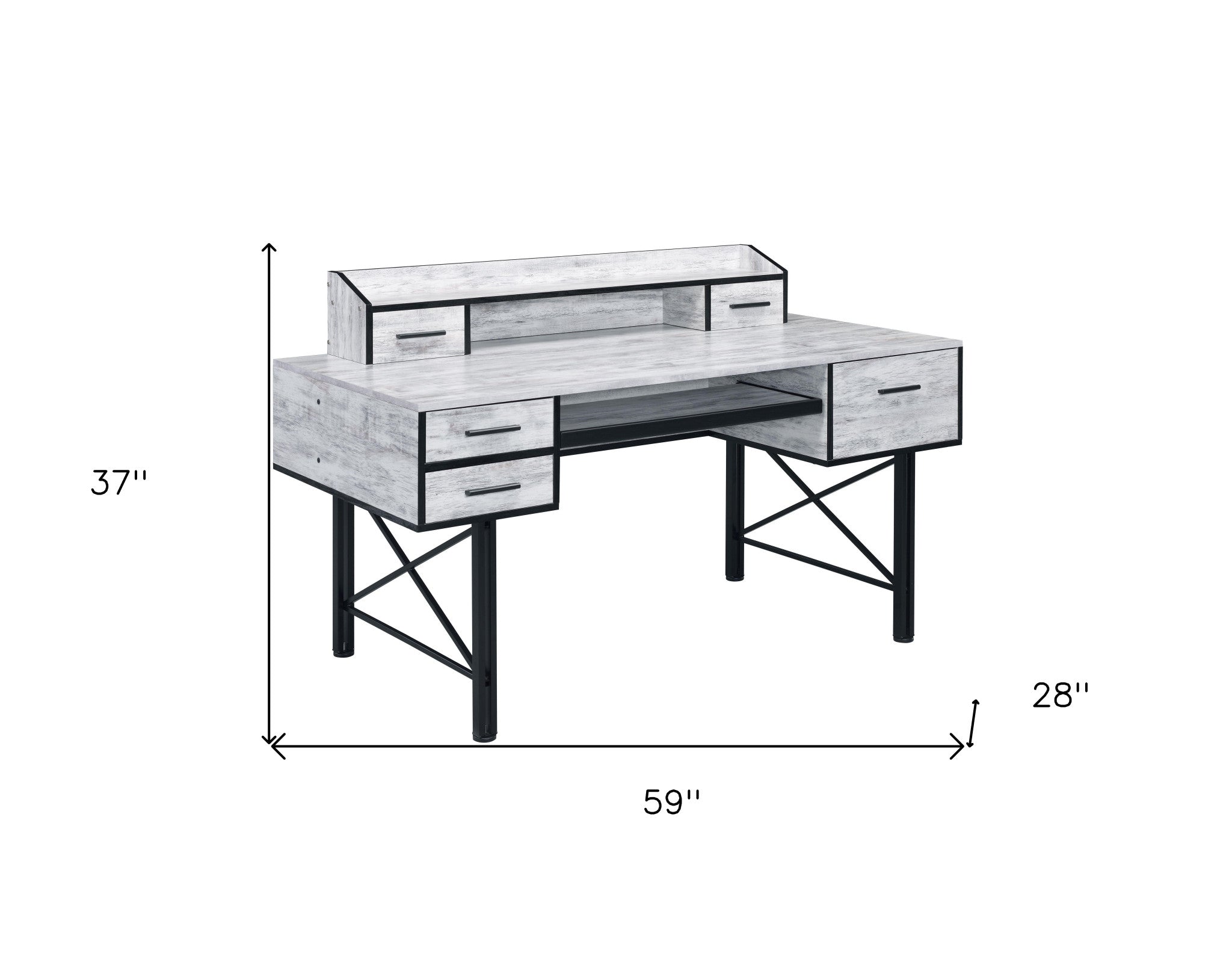 59" Antiqued White and Black Computer Desk With Five Drawers