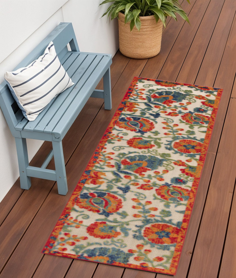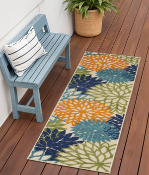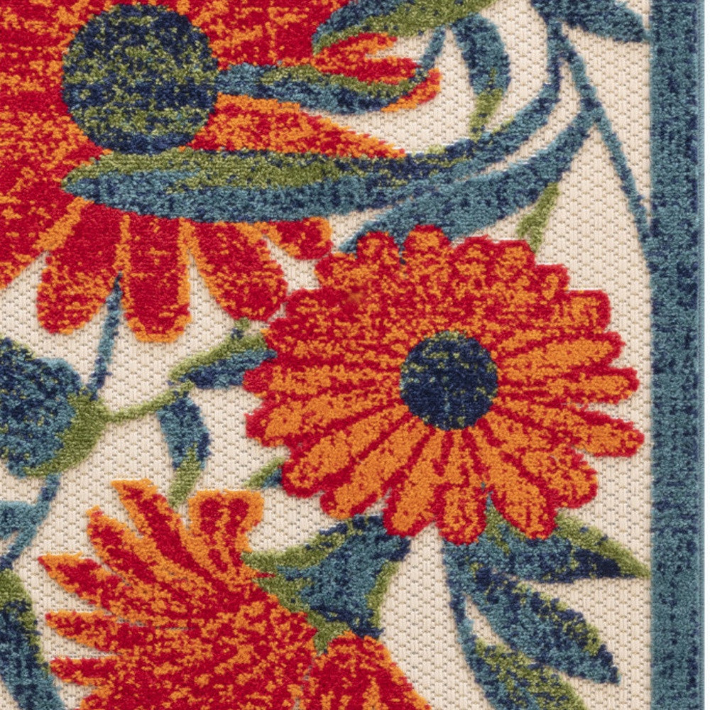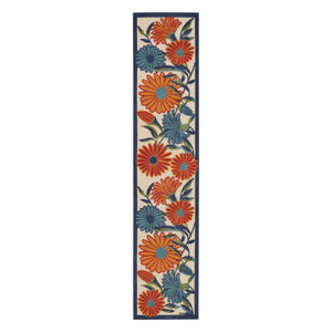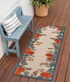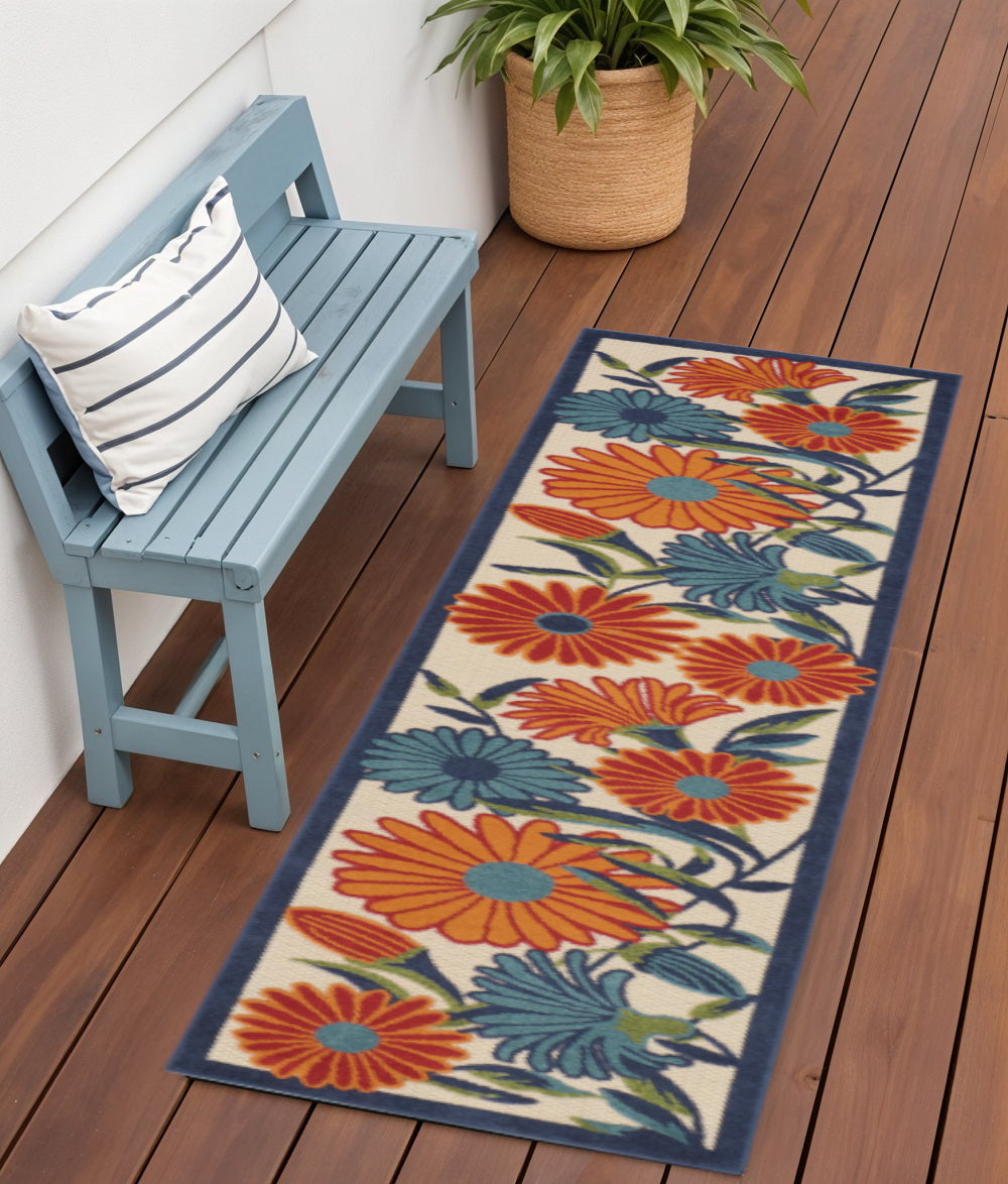 6' Ivory Blue And Orange Floral Indoor Outdoor Runner Rug