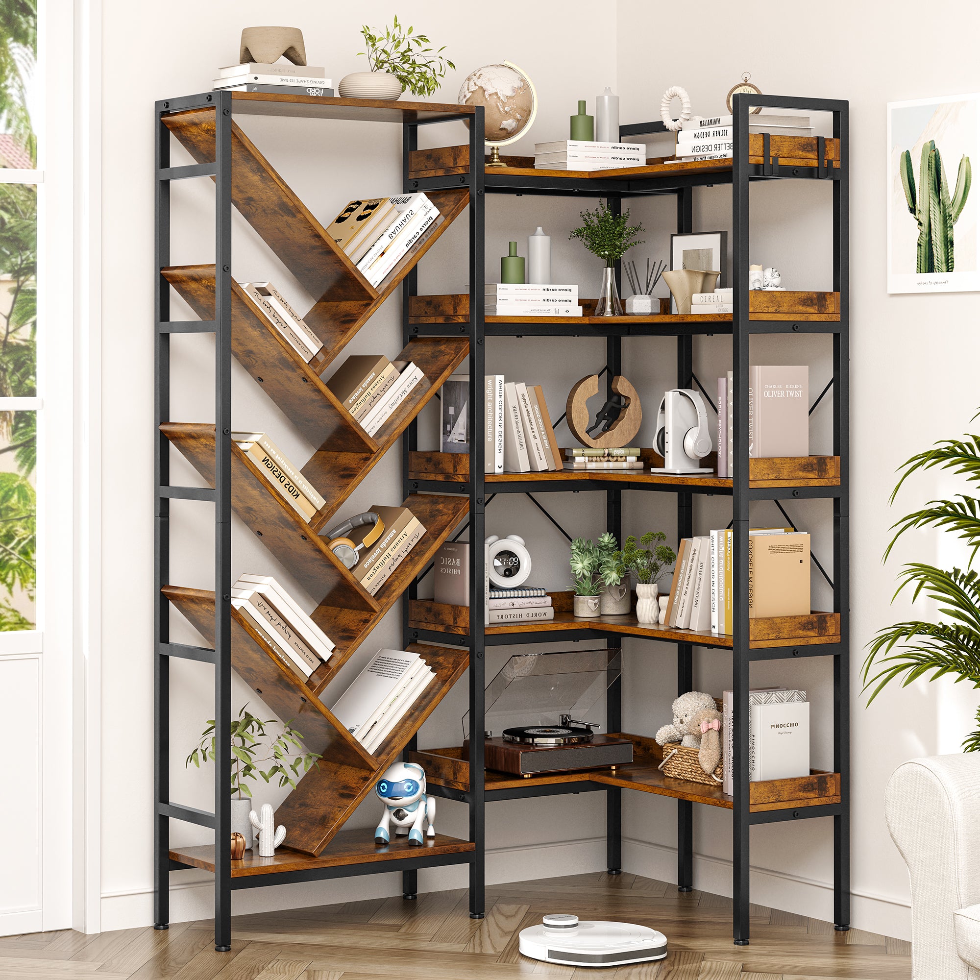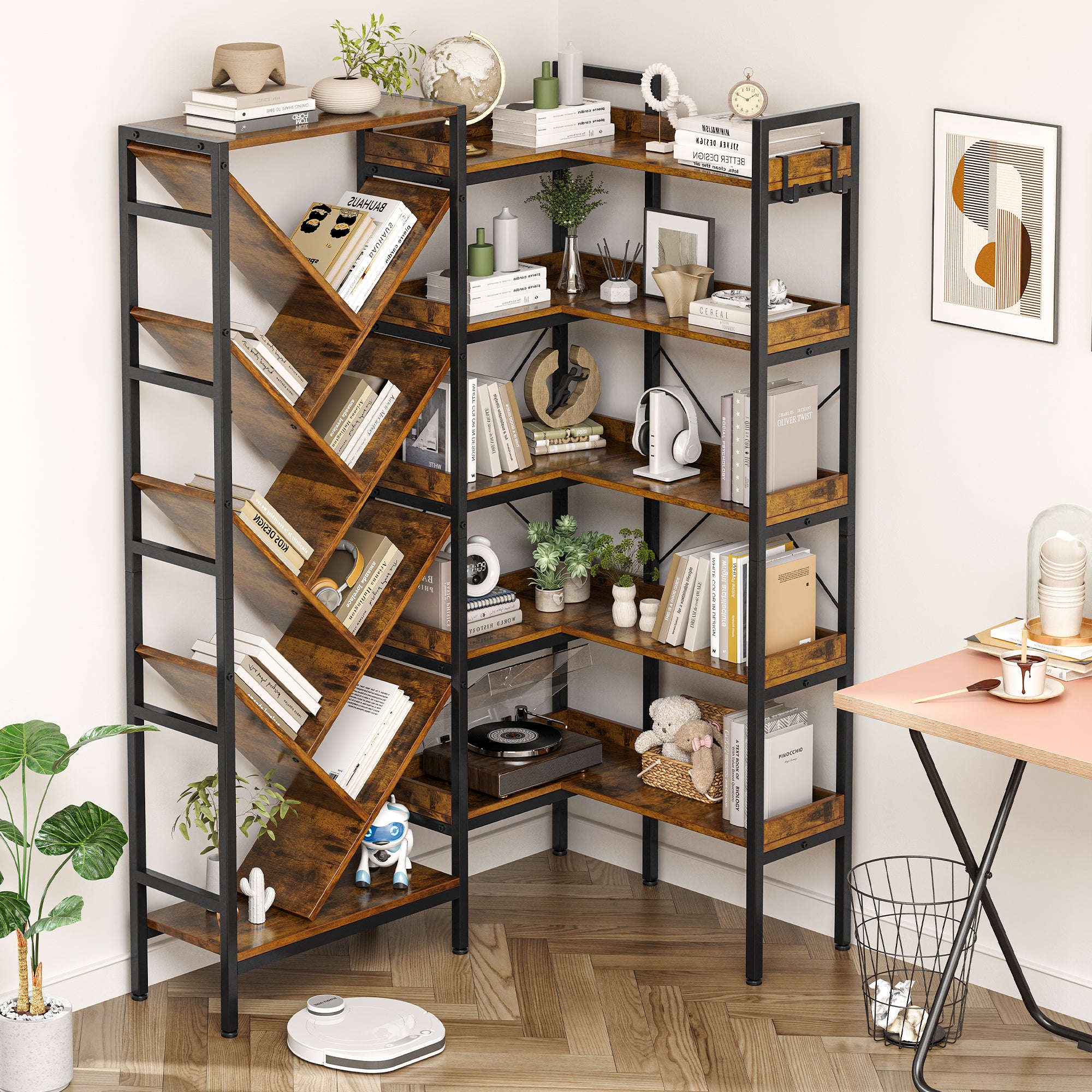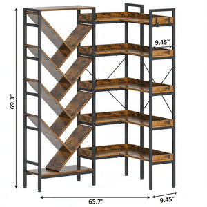 69" Brown And Black Wood And Metal Ten Tier Corner Bookcase
