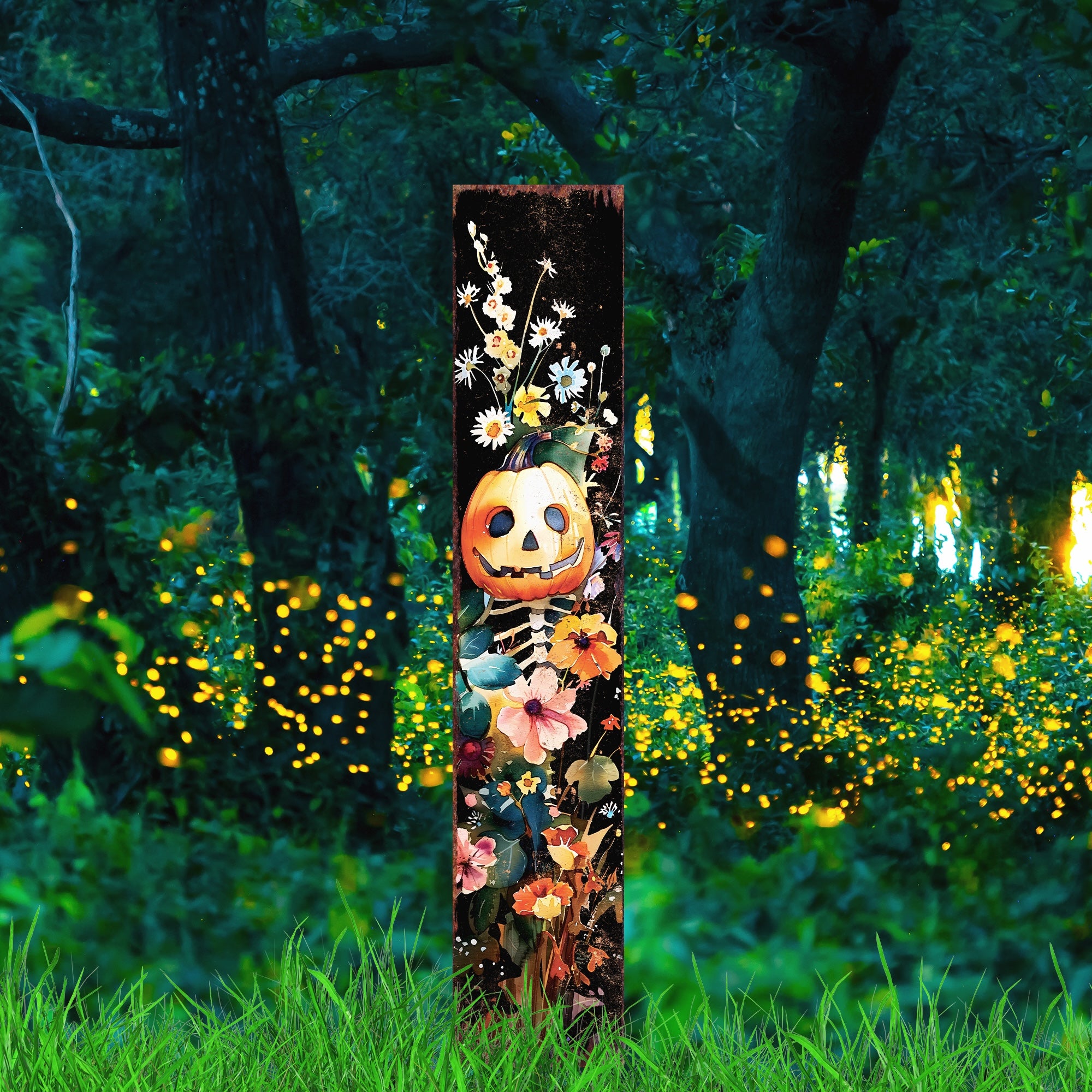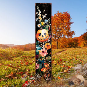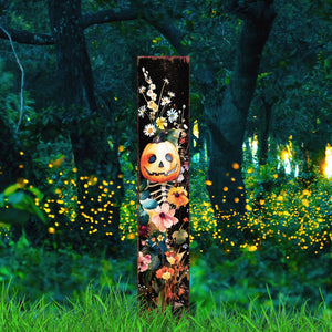 7" Black Orange Pink And White Solid Wood Watercolor Floral Halloween Jack-O-Lantern Garden Stake