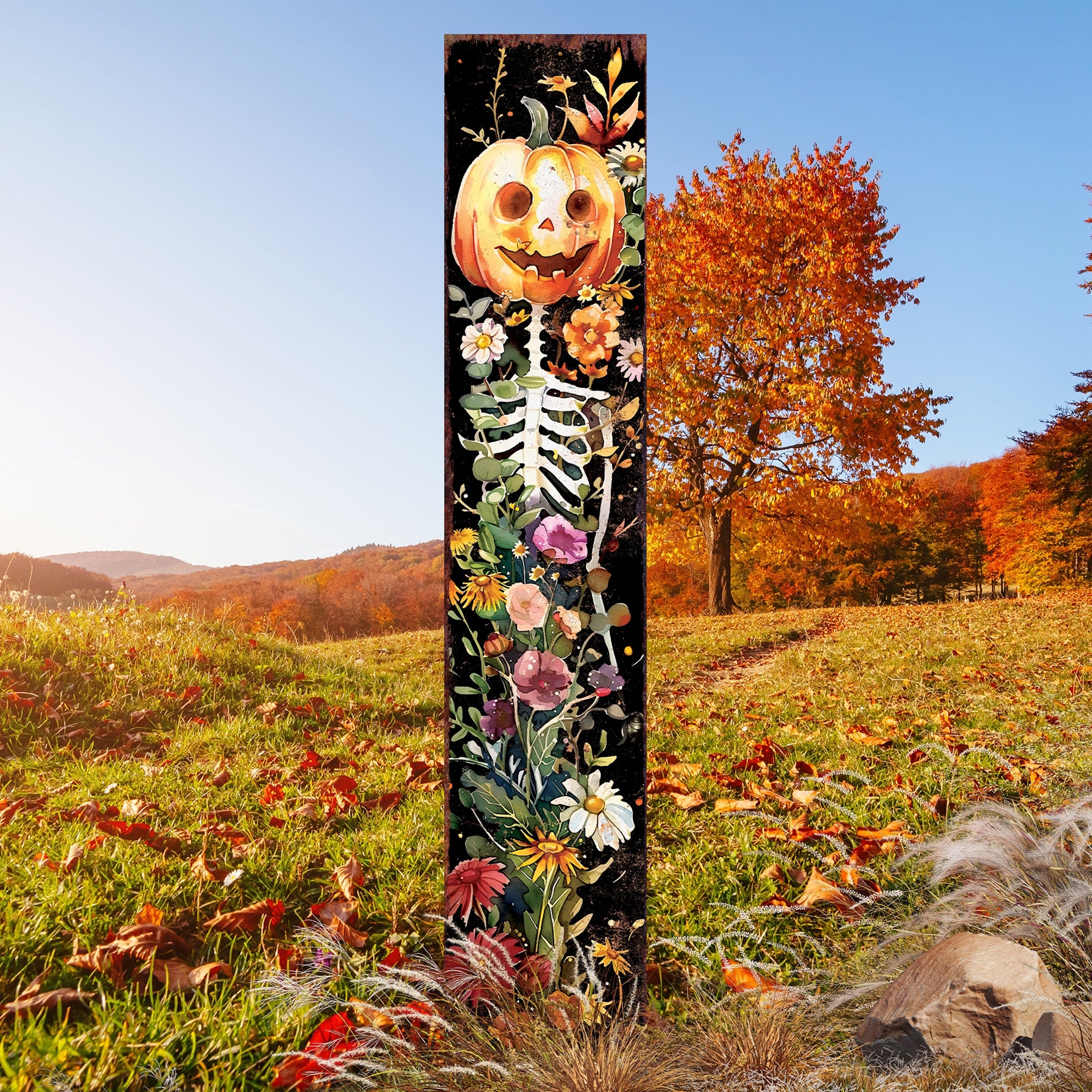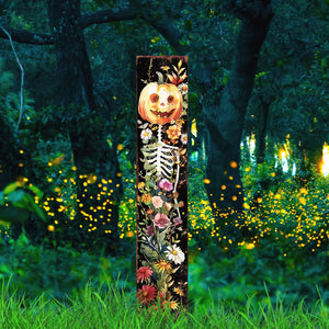 7" Black Orange White And Green Solid Wood Watercolor Floral Halloween Jack-O-Lantern Garden Stake