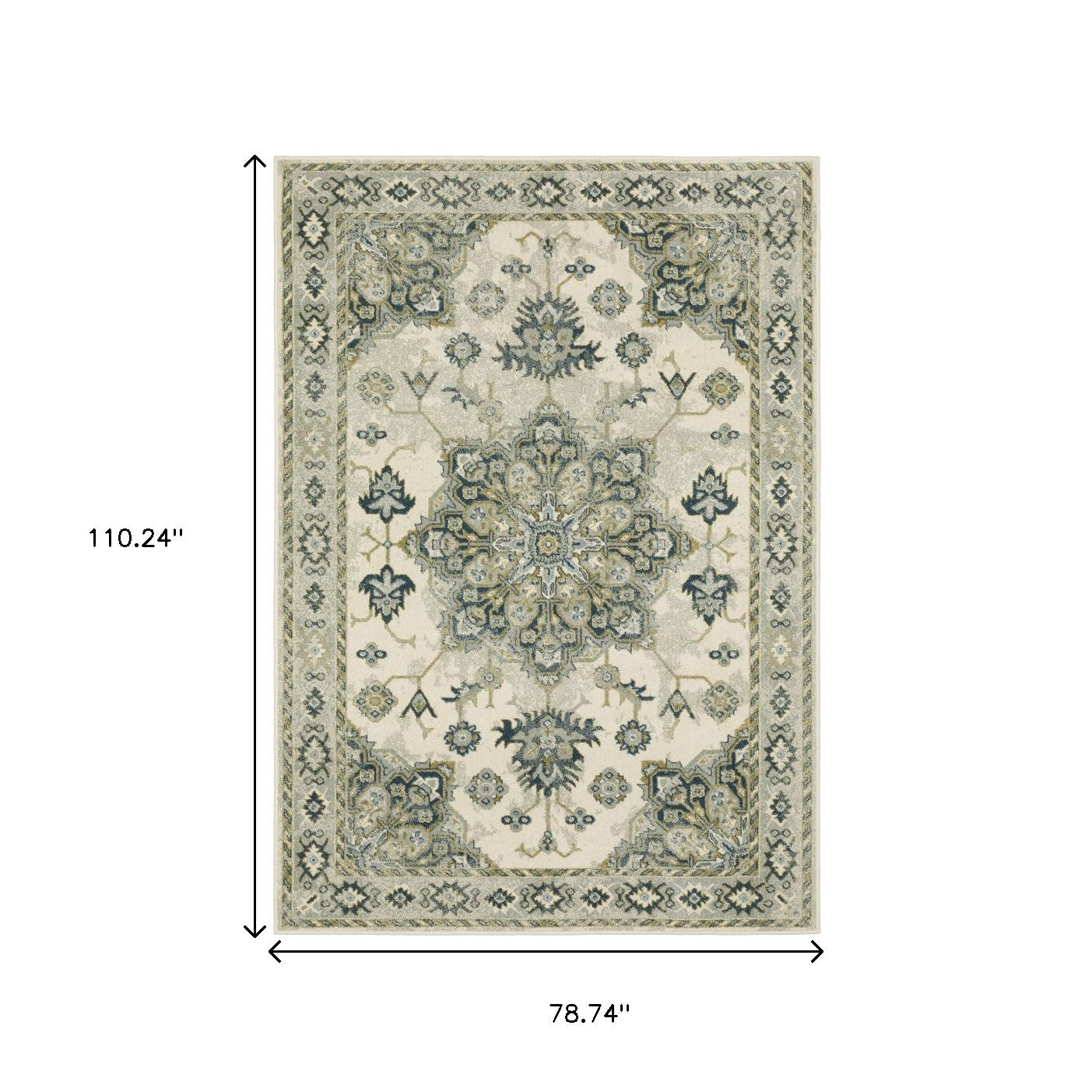 7' X 9' Ivory And Blue Oriental Distressed Area Rug