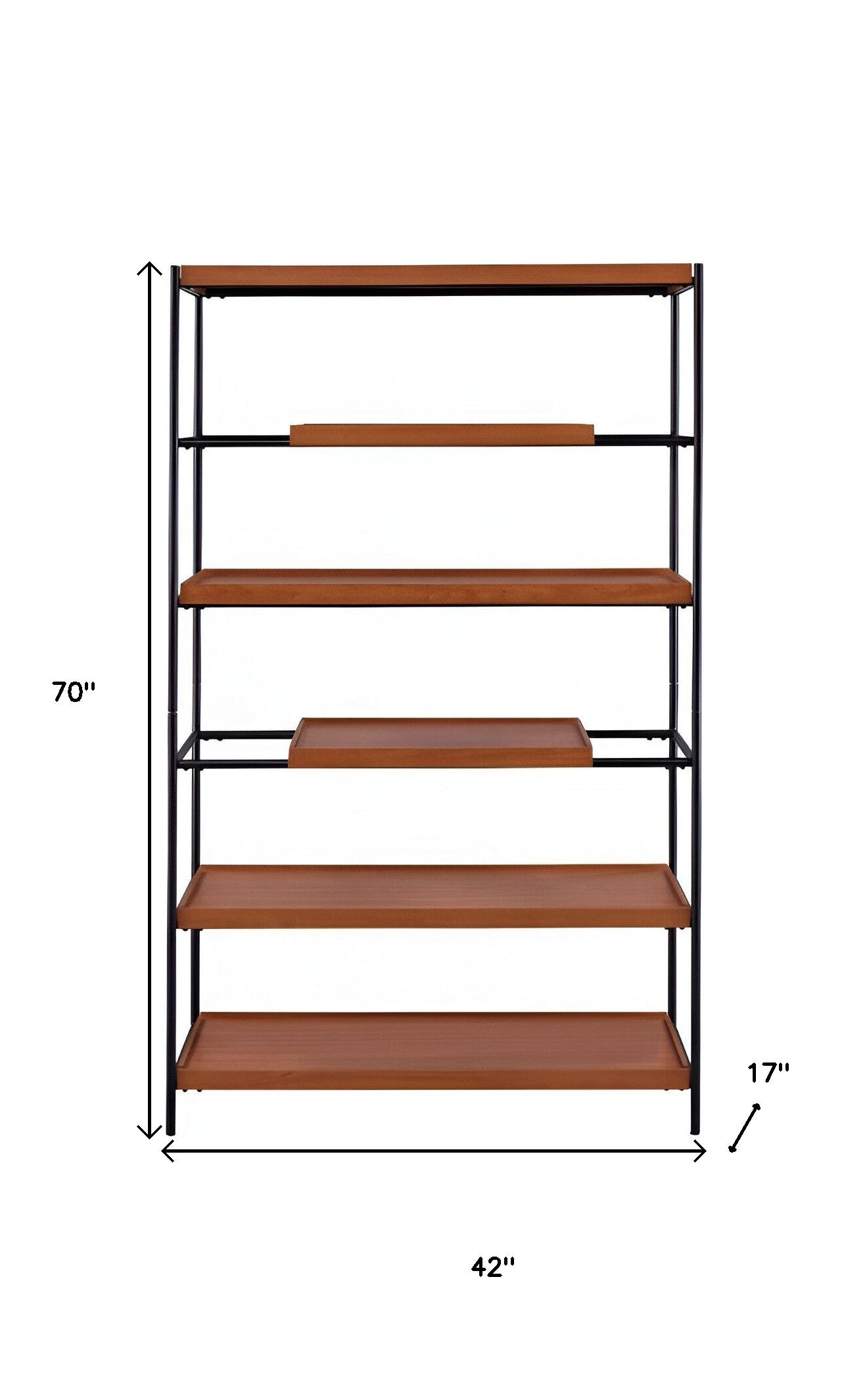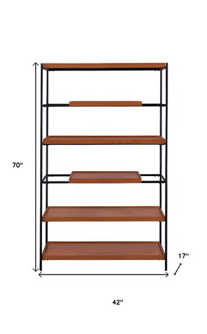 70" Oak And Black Metal and Wood Six Tier Etagere Bookcase