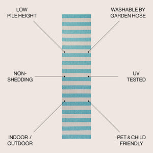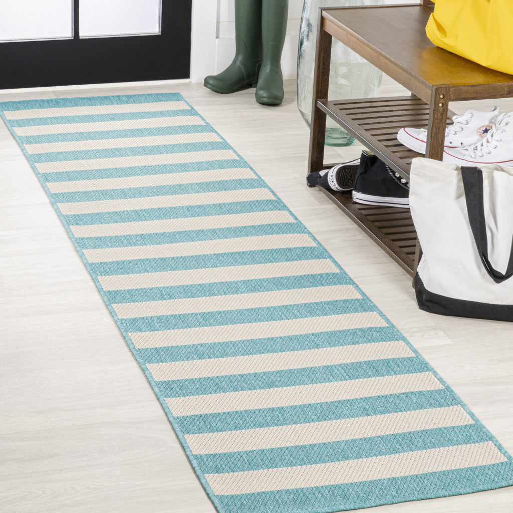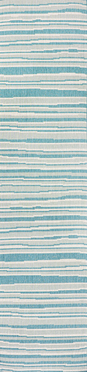 8' Aqua And Cream Striped Indoor Outdoor Runner Rug