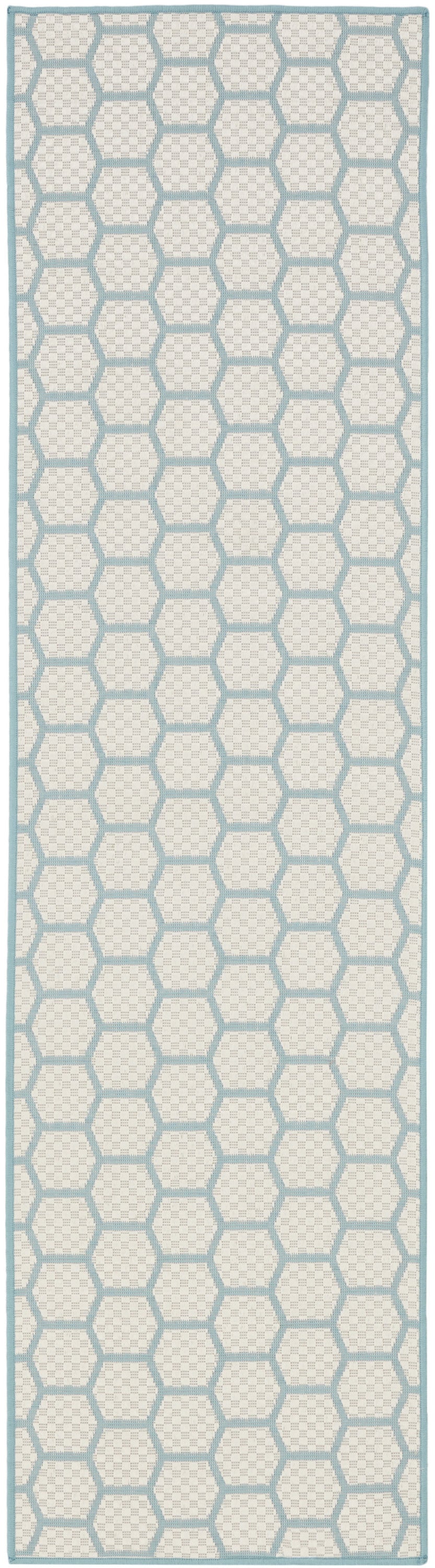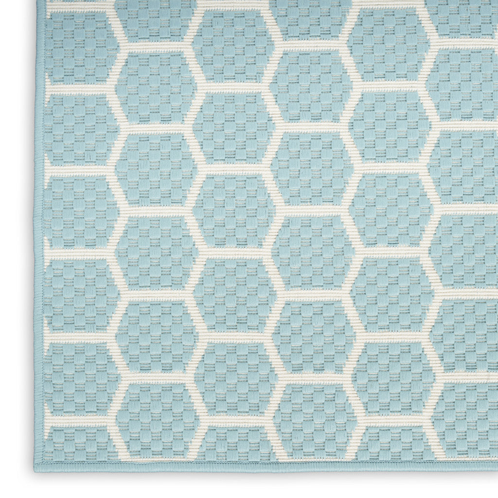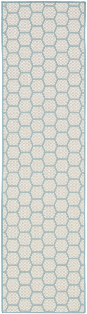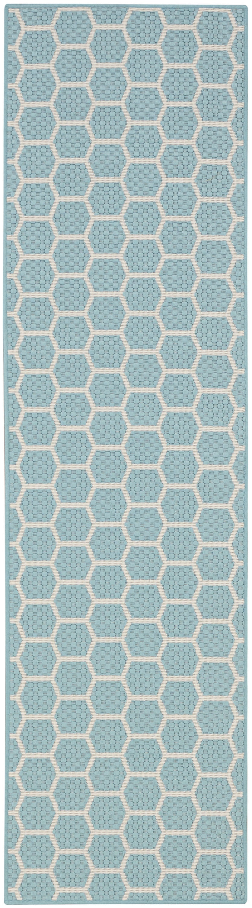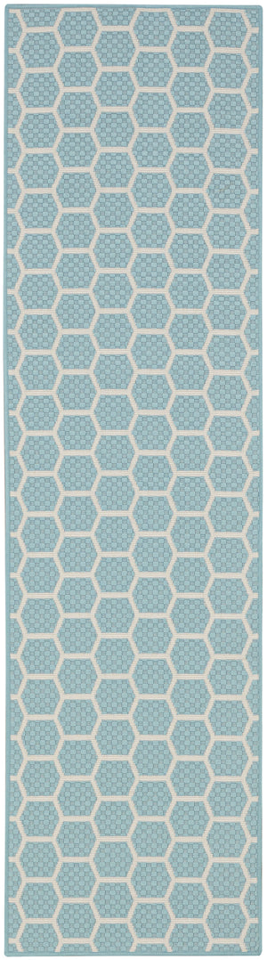 8' Aqua And Ivory Geometric Indoor Outdoor Runner Rug