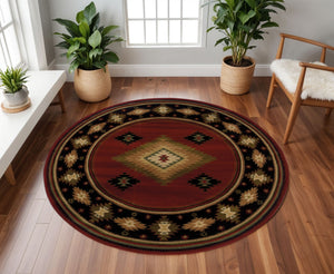 8’ Round Red And Beige Ikat Pattern Area Rug