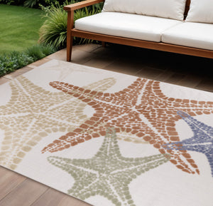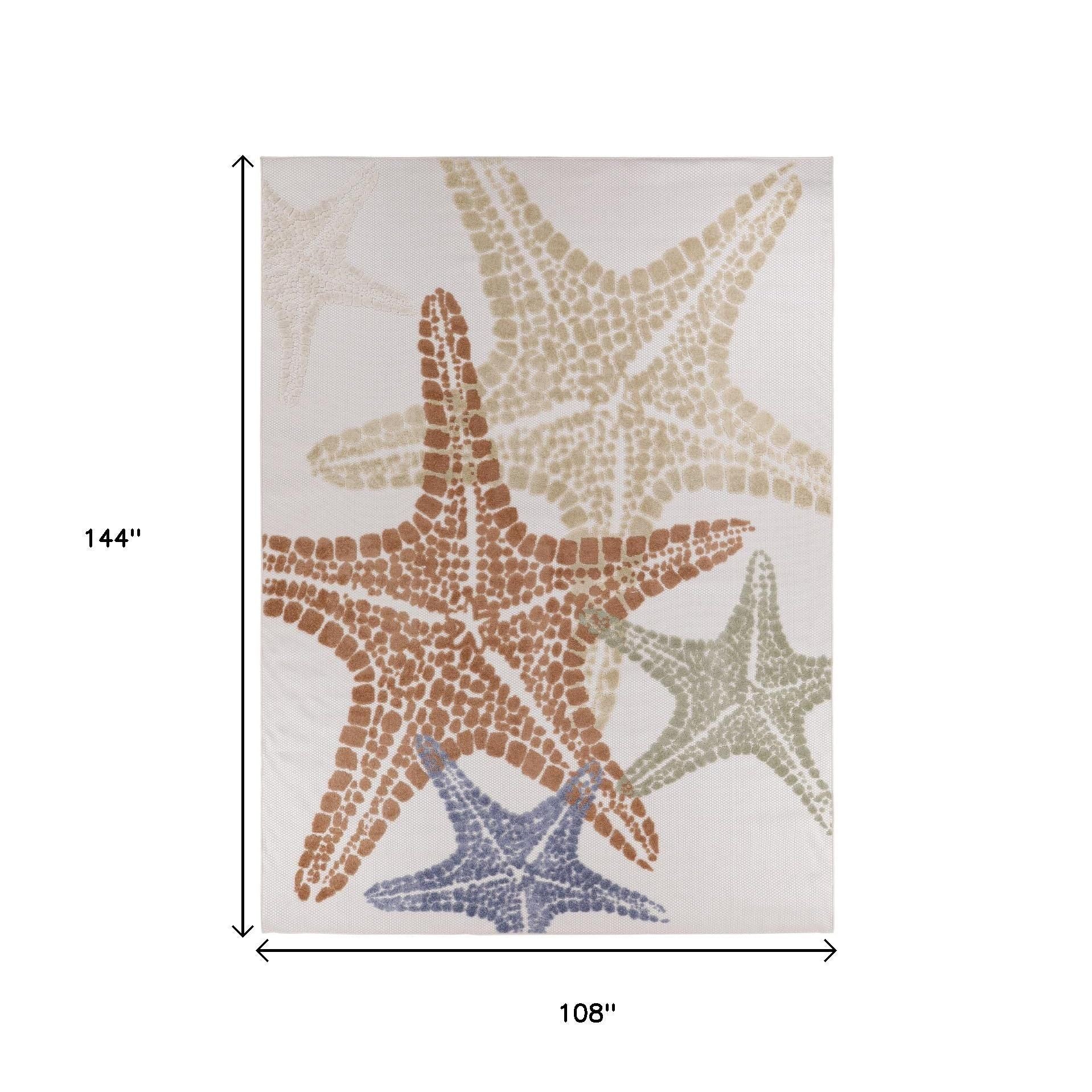 9' X 12' Ivory Blue Yellow Orange And Green Starfish Indoor Outdoor Area Rug